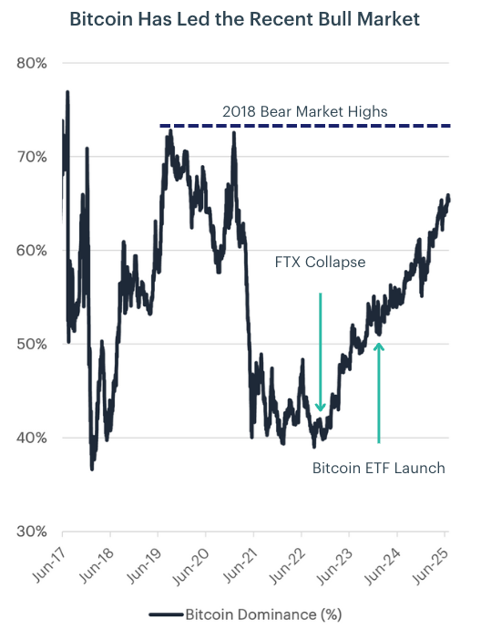 The CLARITY Act that came out of the financial services committee will establish the comprehensive regulatory guardrails sought by investors and operators. By delineating the SEC’s role over tokenized securities and the CFTC’s jurisdiction over digital commodities, the bill will remove the uncertainty that has deterred advisors, endowments, and other institutions from allocating meaningful capital to crypto markets. Registration guidelines for exchanges and intermediaries, coupled with explicit DeFi provisions and standardized disclosure requirements, will create an on-ramp for traditional financial firms to engage with digital assets under familiar compliance frameworks . With these guidelines in place, we expect a wave of new product launches and capital formation in 2026. We believe the CLARITY Act’s will pass the house or the senate in late 2025 and will mark the inflection point at which capital begins rotating out of Bitcoin into the broader altcoin market.