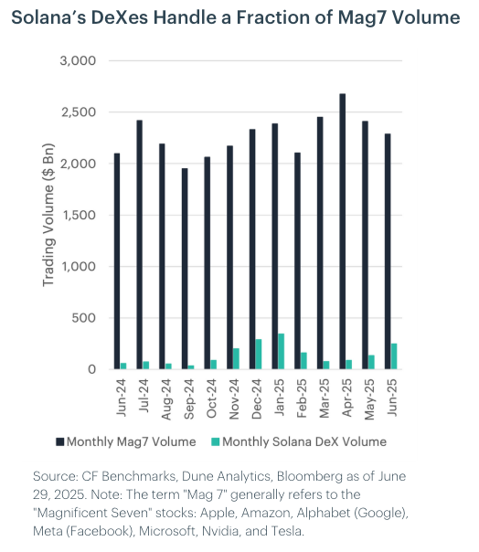 The recent introduction of tokenized equities on layer-1 blockchains represents a significant opportunity for altcoin valuations. Decentralized exchanges (DEXs) on networks such as Solana handle substantial annual trading volumes, in Solana's case, approximately $1.8 trillion, yet these figures remain modest compared to the $27.4 trillion turnover generated by just the seven most liquid U.S. equities. Capturing even a small fraction of traditional equity exchange volumes through tokenization could significantly increase demand for block space and network resources across various layer-1 platforms.