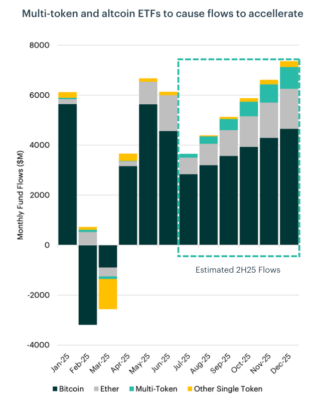 Portfolio Perspective: The launch of multi-token ETFs in 2025 will provide a significant tailwind for large-cap altcoins. Passive inflows into these diversified vehicles should directly benefit tokens in the CF Large Cap Index, as allocators seek exposure to established digital assets. We anticipate that, in H2 2025, large-cap assets will capture the majority of ETF-driven demand, narrowing their performance gaps with Bitcoin.