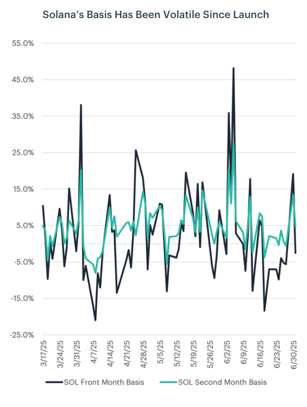 The launch of the first U.S. spot‑Solana ETF on July 2, 2025, in addition to the launch of CME Solana futures earlier in the year unlocks a basis‑trading opportunity that should attract sophisticated traders in the second half of the year. With an ETF that uses the same benchmark as the CME futures now tradable, arbitrageurs can capture the spread between spot and derivatives markets. While this type of trading is market‑neutral, the capital committed to monetize the basis will boost two‑way liquidity in both venues, tightening bid‑ask spreads and enhancing price efficiency for SOL.
