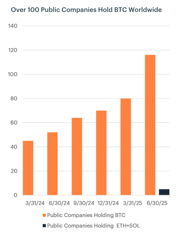 In 2025 we have seen rapid corporate adoption of Bitcoin as a treasury asset. Currently, 116 public firms report direct BTC holdings, up from 52 a year earlier. Two archetypes have emerged: purpose-built treasury companies that raise capital expressly to buy Bitcoin, and operating companies that keep smaller allocations alongside cash for diversification. The dedicated model has delivered outsized equity returns and is increasingly viewed as a template that can migrate to digital assets beyond Bitcoin.