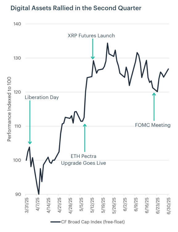 Digital assets weathered a turbulent second quarter, buffeted first by protectionist headlines and later by shifting monetary expectations. In April, President Trump’s tariff announcement lifted effective U.S. import duties above 20 percent, sending the S&P 500 and Nasdaq briefly into bear-market territory and pushing the 10-year Treasury yield higher. Risk aversion initially spilled into crypto; nevertheless, spot-Bitcoin ETFs attracted $2.2 billion of inflows, underscoring demand for hedges against policy uncertainty and monetary debasement.