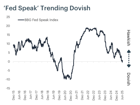 Amid this uncertainty, the political spotlight on the Fed is intensifying. We expect President Trump to name a preferred successor to Chair Powell well before his term expires in May 2026, effectively installing a “shadow Fed chair” who will shape policy expectations from the sidelines. This nominee is likely to promote a more dovish stance, calling for aggressive rate cuts and easier financial conditions. Even without formal authority, a shadow chair’s public signaling may shift sentiment and increase pressure on the Fed to act, especially if inflation begins to reaccelerate. Should such a figure emerge, we expect Fed speak to flip decisively dovish in the second half of 2025.