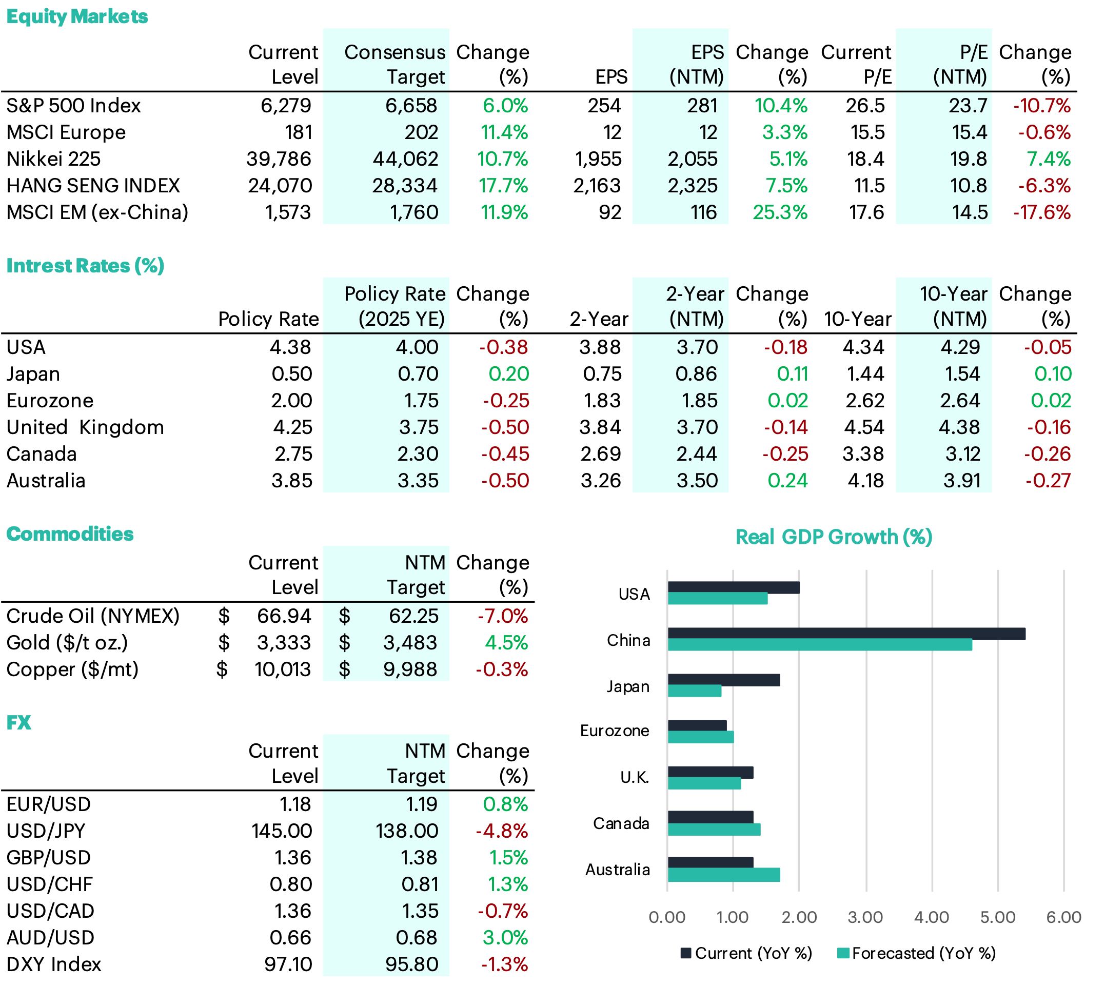 Equities: Analysts maintain a broadly positive outlook for equities, with Hong Kong (+17.7%) and Japan (+10.7%) leading major market forecasts. Emerging markets ex-China (+11.9%) and European equities (+11.4%) are also expected to perform well. U.S. equities are forecast to rise 6.0%, with S&P 500 earnings per share projected to grow by 10.8%. Despite ongoing valuation compression, particularly in the U.S. and emerging markets, earnings growth remains a key support, especially in Japan and EM.