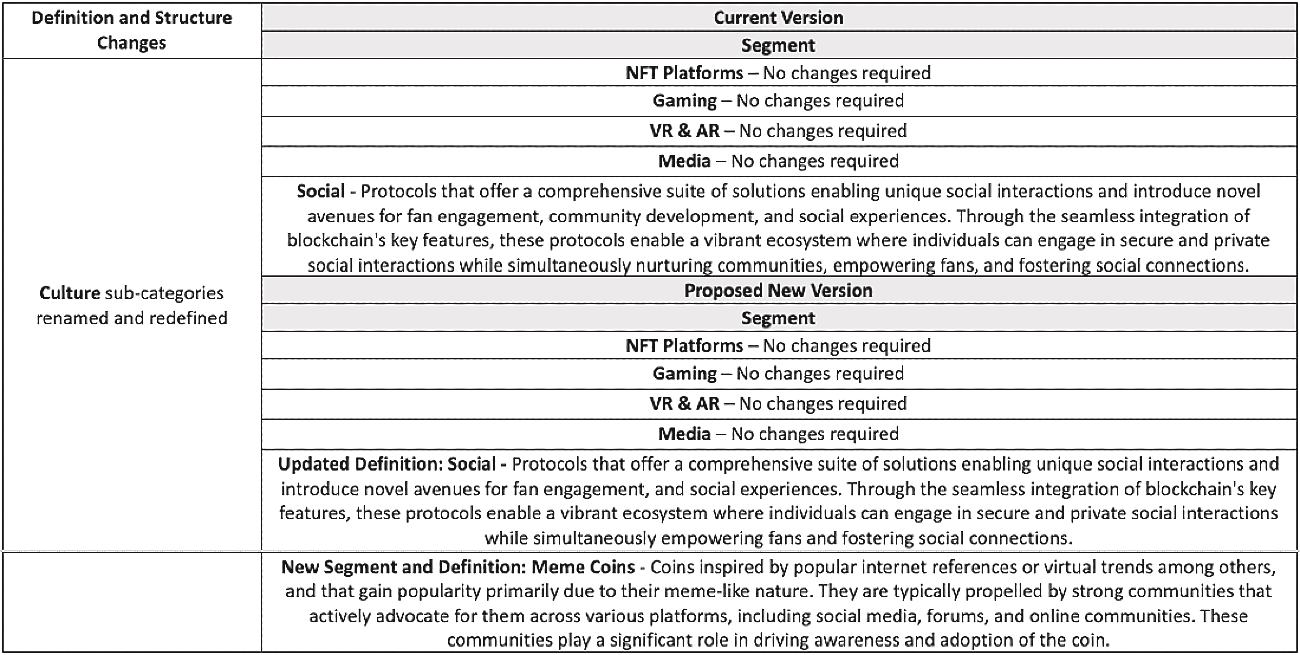 The latest review of the CF Investible Universe as well as the evolution of Digital Asset definitions resulted in changes to the CF DACS classification structure, and definitions, specifically, a new segment needs to be introduced, and existing definitions need to be updated.