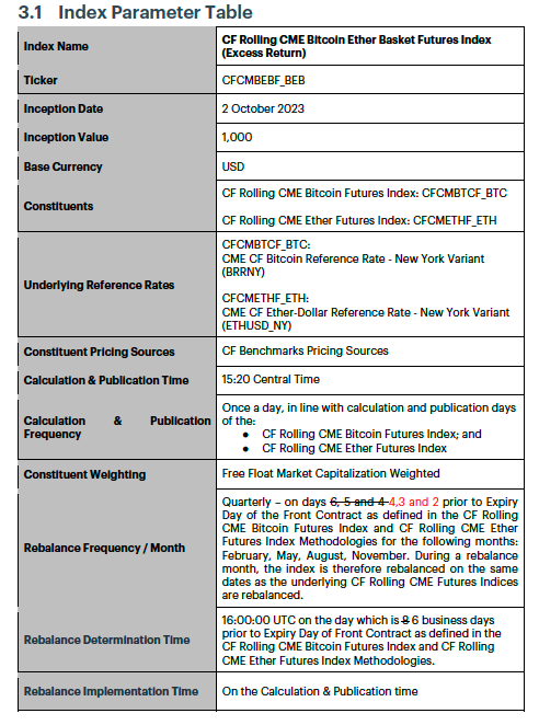 The Administrator proposes to implement the proposed changes to the CF Rolling CME Bitcoin Ether Basket Futures Index methodology at approximately 11:00 London Time on March 28th, 2025; meaning that the index will begin to utilize the new Roll Days outlined above from that date forward.