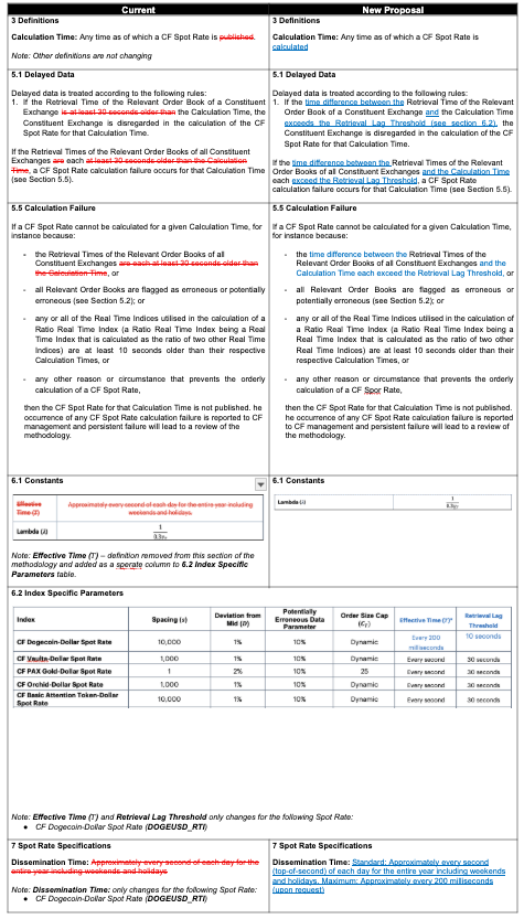 The Administrator is launching a consultation on proposed changes to the CF Spot Rate Methodology Guide relating to CF Dogecoin-Dollar Spot Rate (DOGEUSD_RTI).