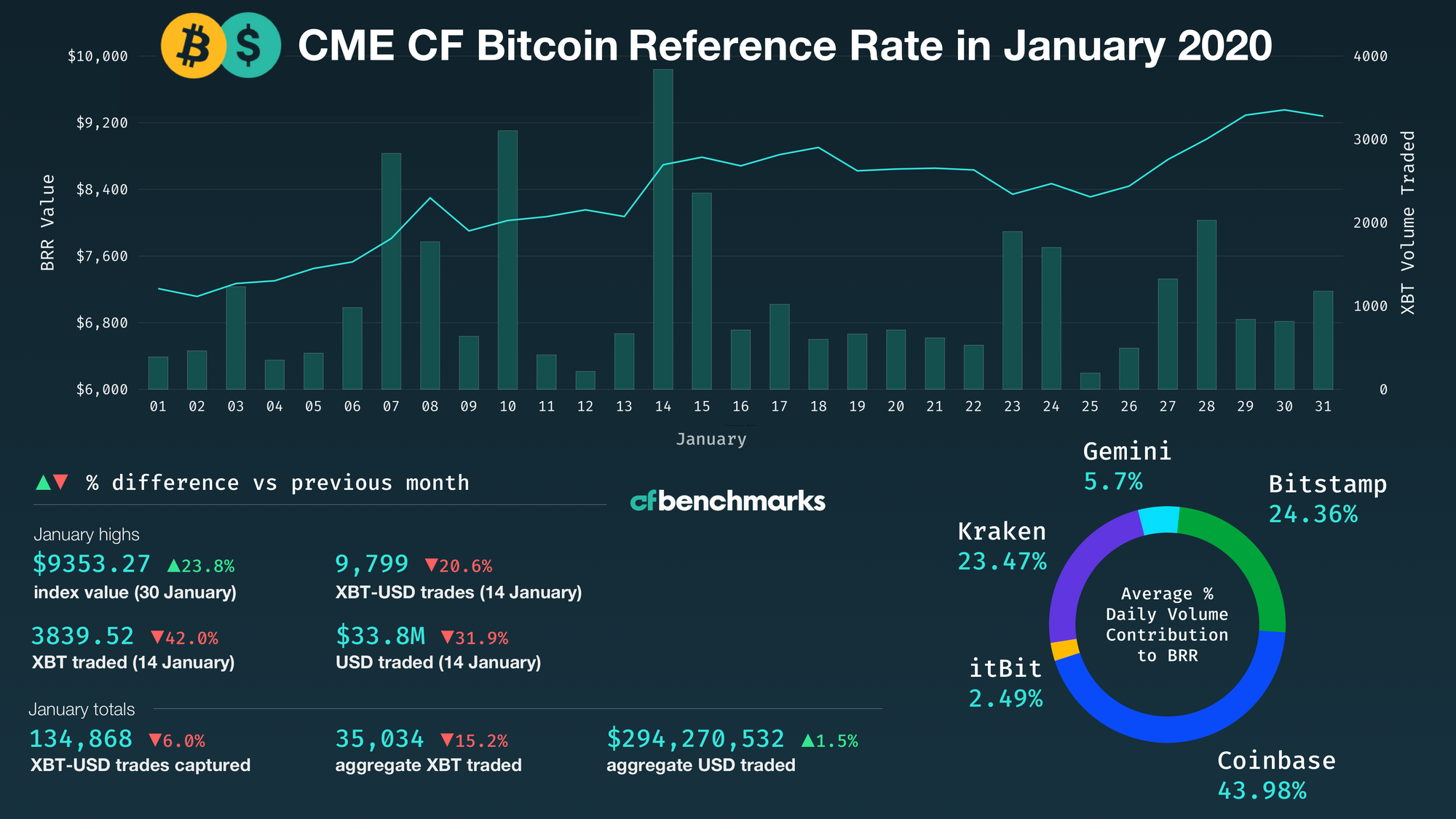 • Highest volume day in (Jan 14) saw 42% less volume  than the highest volume day in previous month (Dec 9), pointing to smoother trading volumes in Jan