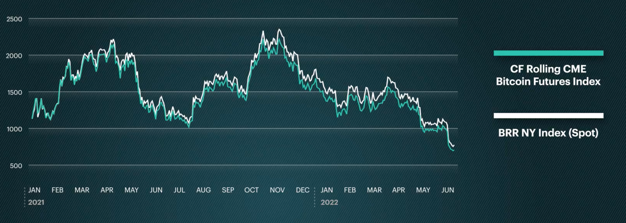 The CF Rolling CME Bitcoin Futures Index was launched on June 20, 2022, with a base value of 1000 as of May 9, 2022. All index values prior to May 9, 2022, are backtested.
