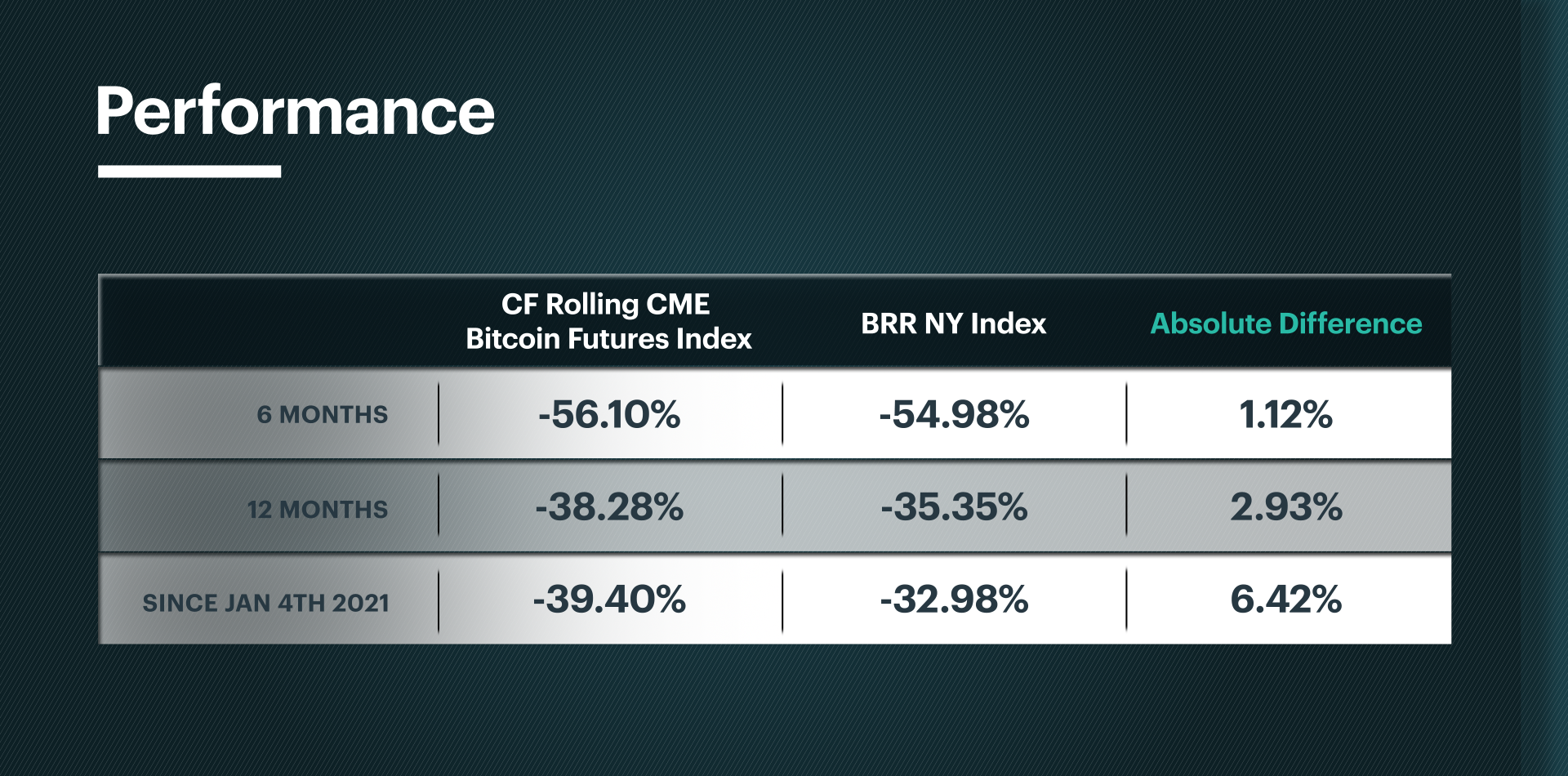 For a quick look at how CF Rolling CME Bitcoin Futures Index captures exposure to CME Bitcoin Futures on a 6- and 12-month basis, as well as to a holding of the contract between January 14th, 2021, to June 21st, 2022, click below to watch a short animation.