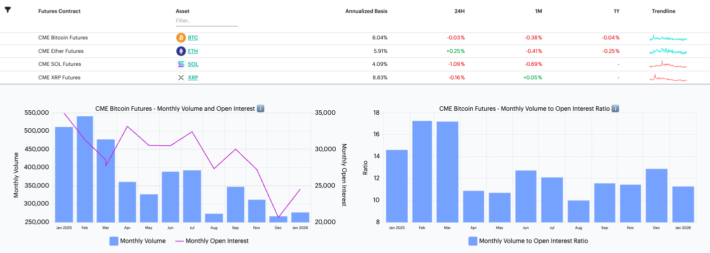 The Basis Screener tracks futures basis across CME Bitcoin, Ether, SOL and XRP contracts. It begins with a comparative snapshot of annualized basis across contracts, then places that signal alongside monthly volume, open interest and the ratio between the two. As such, seen in context, the dashboard offers a cleaner view of carry, leverage demand and the shape of participation in listed crypto futures.