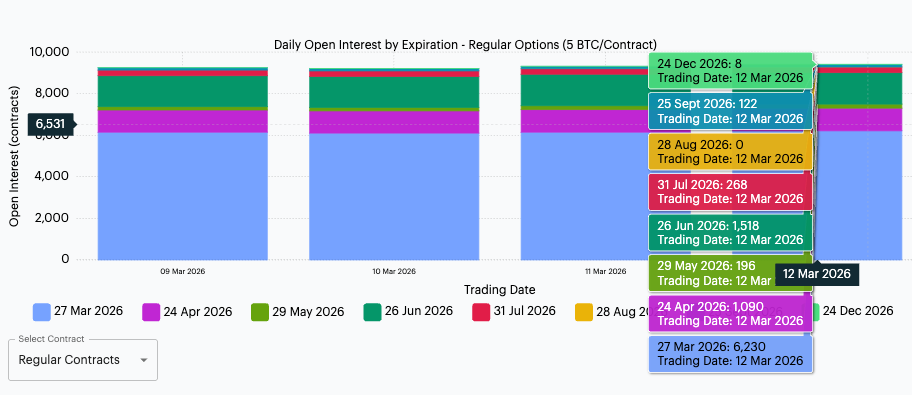 It's worth noting that the page is also built to be interrogated rather than merely viewed. Individual maturities can be inspected directly, with the chart surfacing contract counts for specific expiries on interaction. Around larger expiry dates or more volatile trading periods, that makes the screen materially more useful than a static aggregate.