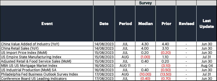 Next week's lineup of economic data is anticipated to be considerably less eventful. Investors should direct their attention towards July's Retail Sales data, as it will provide insight into whether financial challenges are gaining momentum, potentially leading to decreased demand. Regarding pricing trends, the most recent import price statistics are expected to exhibit a slight uptick, following a sequence of downside surprises. This prompts the question: are these disinflationary trends enduring? With the consensus forming that the Federal Reserve's battle against inflation might be in its final innings, the possibility of inflationary surprises cannot be dismissed as we move through the remainder of the year.