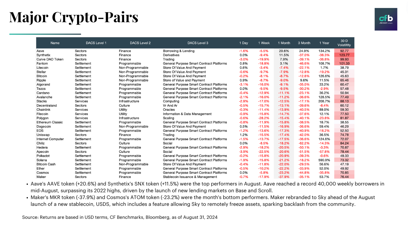 The following is an excerpt of the Monthly Market Recap for August 2024, produced by the CF Benchmarks Research team, Gabriel Selby, CFA, and Mark Pilipczuk.