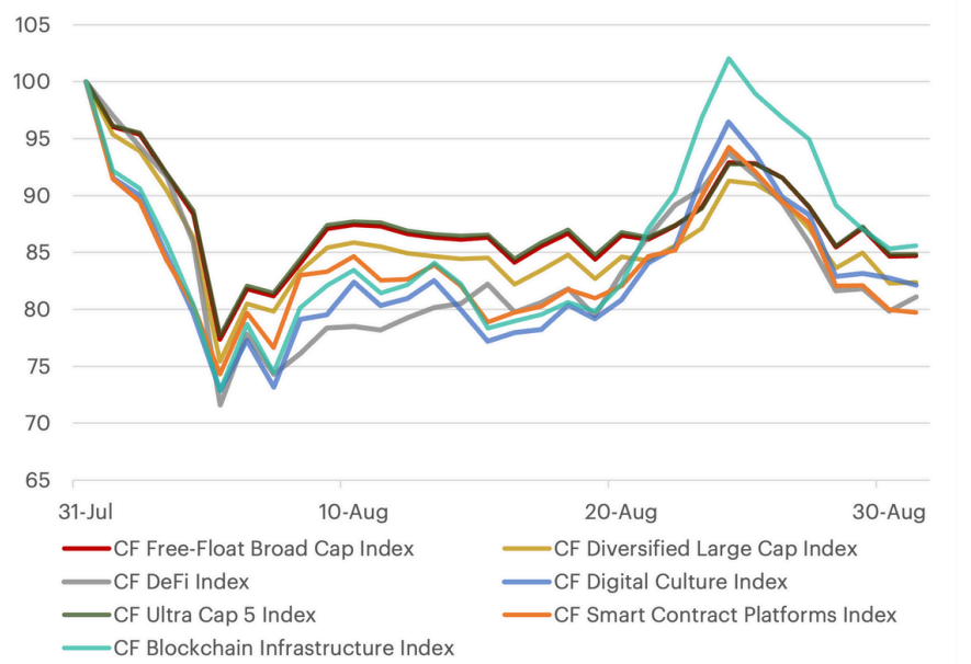 The CF Benchmarks research team’s regular Monthly Market Recap shows August's performance could well form the basis of the dominant trend for September, which is statistically among the weakest months for risky assets.