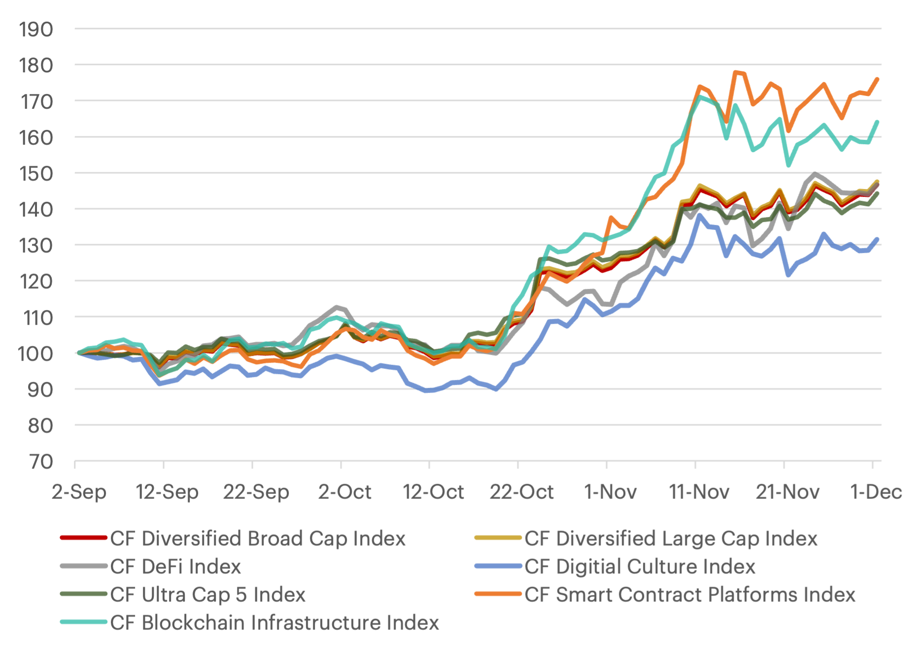 Given the current backdrop, investor sentiment has become more constructive for the digital asset class. All of our flagship portfolio indices posted strong performance over the last rebalance period, outperforming traditional risky assets, such as U.S. and global equity markets by a wide margin. The CF Web 3.0 Smart Contract Platforms Index led the pack, with the CF Blockchain Infrastructure Index coming in a close second. Both category indices outperformed the broader market (as measured by the CF Floating Broad Cap Index) by a significant margin. Lastly, the CF Digital Culture Composite Index continued to struggle, lagging behind the rest of the major portfolio indices for the second straight rebalance period.