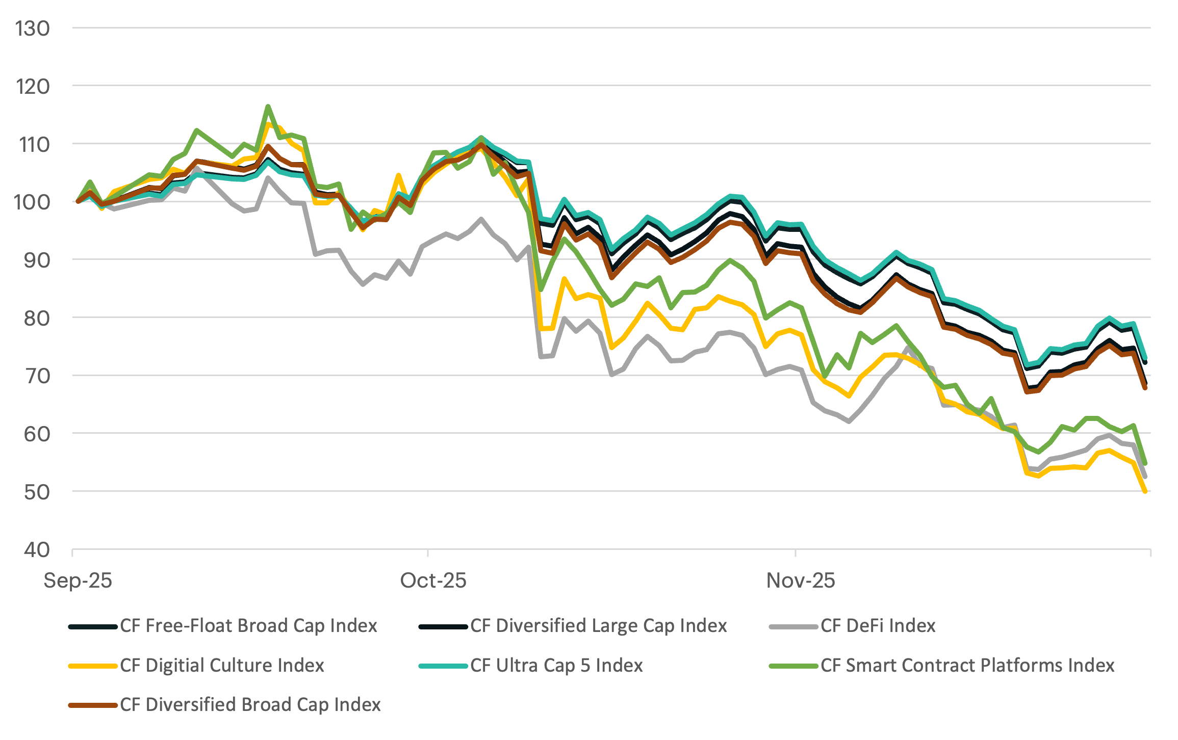 The degree to which Bitcoin and Ether outperform mid- and smaller-cap tokens during drawdowns serves as a reliable barometer for market risk sentiment. The CF Free-Float Index captures this mega-cap exposure, while the Diversified Broad Cap methodology spreads weight more evenly across the market-cap spectrum. As shown in the lower panel, the performance ratio between these benchmarks has historically spiked during risk-off episodes, most notably during April's trade-war-driven selloff following "Liberation Day" tariff announcements. The current period mirrors that dynamic: the ratio has risen back toward recent highs, confirming that mega-cap assets have once again declined less than broader altcoin exposure.