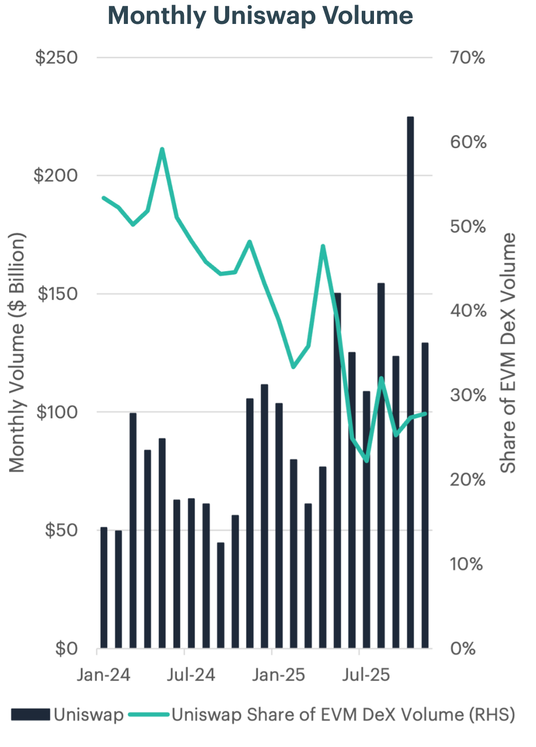 Uniswap’s recent outperformance has been driven largely by the market’s reassessment of its long-term economics following the proposal for a protocol-level fee switch. To contextualize the potential value creation for token holders, it is useful to frame both the scale of Uniswap’s underlying activity and the structural change in protocol fees. Uniswap processed an average of roughly $73B in monthly trading volume throughout 2024. In 2025, activity accelerated materially, with year-to-date monthly volume averaging approximately $122B, representing a ~65 percent increase. October 2025 marked a cycle high at $225B, more than quadruple early 2024 levels. While Uniswap’s market share has fallen as DEX competition on the EVM has intensified, it still accounts for roughly 30 percent of total volume and has held relatively steady since its market share bottomed out in June 2025.