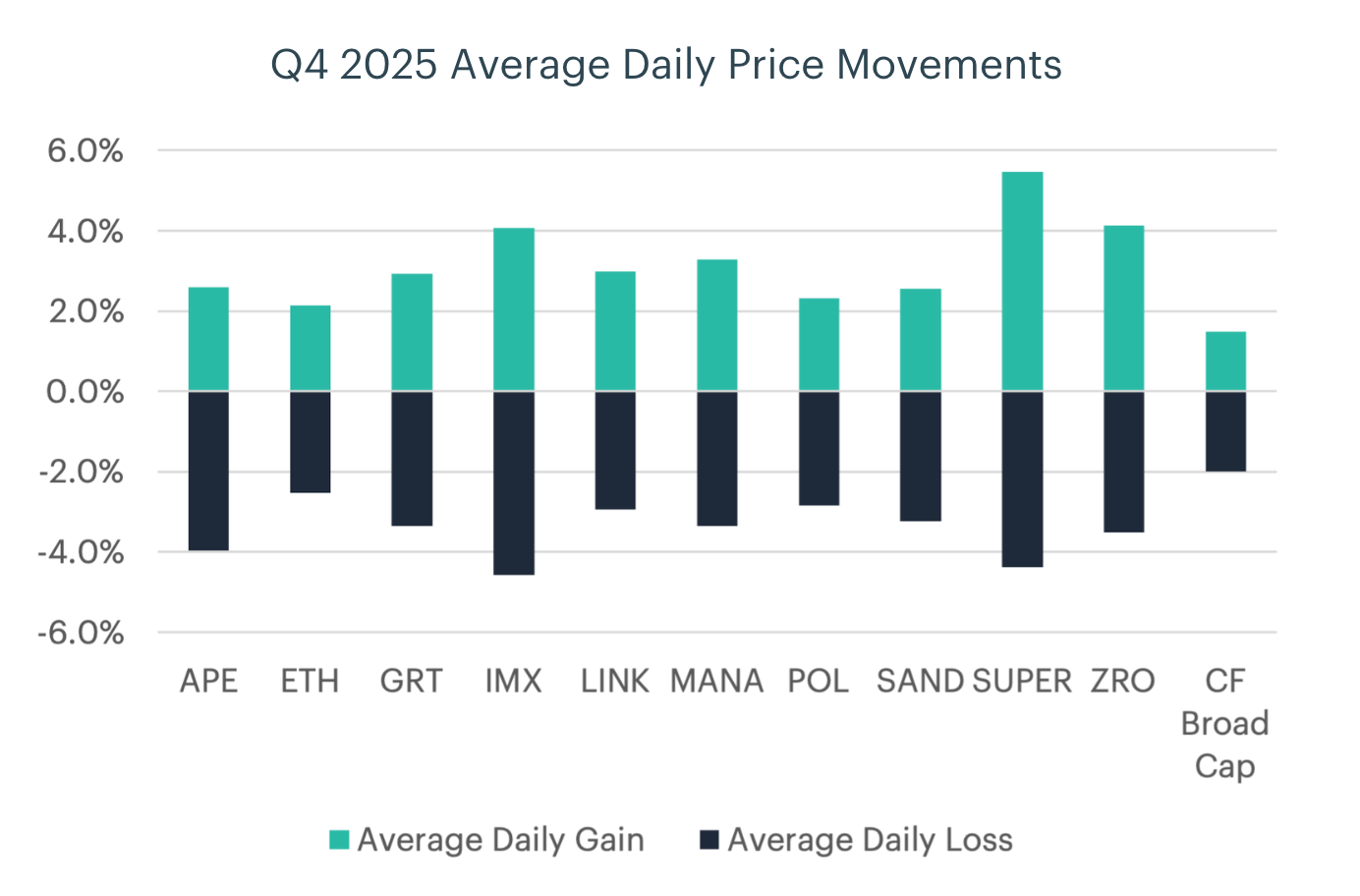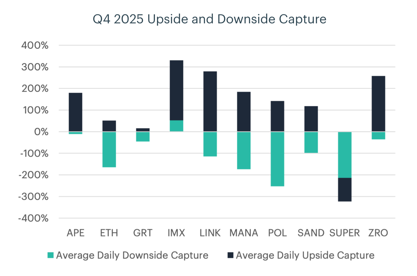 Average daily returns reinforce this dynamic. Tokens posted higher gains than the market on up days, but losses on down days were far larger, creating significant volatility drag. Assets such as MANA, POL, and SUPER showed extreme downside capture, allowing a small number of deep declines to overwhelm sporadic rallies. In this environment, conditional outperformance on up days could not offset the cumulative effect of repeated, outsized losses.