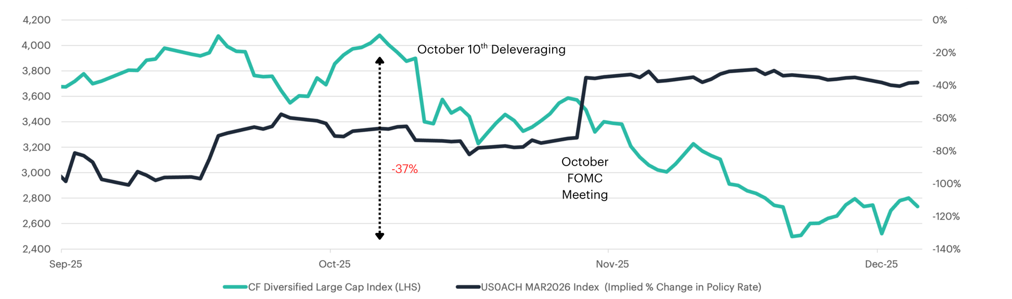 The sharp repricing of rate-cut expectations following the October FOMC meeting has driven a deep deterioration in risk sentiment, pushing the CF Diversified Large Cap Index down roughly 37%, firmly within what we define as “correction” territory for crypto (a 20–45% pullback, the volatility-adjusted analogue to the 10–20% equity correction band in U.S. large caps). As futures markets steadily priced out the aggressive easing path that investors had anticipated for 2026, the policy-rate curve moved higher and the macro backdrop for long-duration assets deteriorated. This shift came on the heels of the October 10 liquidation event, when tariff uncertainty and a broad de-risking across global markets forced widespread deleveraging in crypto. The chart shows that, while implied policy rates grind steadily less dovish, large-cap digital assets transition from a volatile consolidation into a sustained downtrend. Higher expected real rates compress valuations, reduce the attractiveness of speculative growth exposures and encourage a rotation back into cash and short-duration instruments. Absent clearer evidence of disinflation any rebounds in large caps are likely to be tactical; however, with rate cuts now largely priced out, a sequence of benign data that delivers further disinflation without a growth scare could create meaningful upside alpha as markets scramble to reprice a renewed easing path.