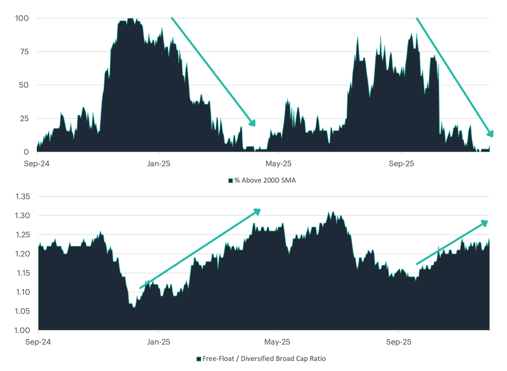 This defensive positioning is corroborated by market breadth in the upper panel. The percentage of tokens trading above their 200-day moving average, which approached 90% during peak risk appetite earlier in 2024, collapsed to single digits by year-end and remains suppressed. The simultaneous rise in the free-float ratio and deterioration in breadth confirms the recent environment has been characterized by concentration rather than participation. Leadership is confined to the most liquid assets, while the vast majority of tokens have broken below long-term trend support. For sustainable broadening, where diversified exposure outperforms and breadth expands, market conditions would need to stabilize, with easing macro uncertainty and returning risk appetite allowing capital to rotate back down the quality curve.