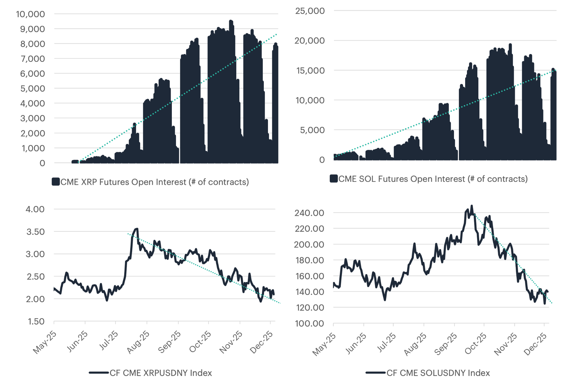 The CME Group’s expansion beyond Bitcoin and Ethereum regulated futures, with Solana futures launching on March 17 and XRP futures following on May 19, has been a pivotal development for institutional access. With nearly all CF Ultra Cap 5 Index constituents now supported by regulated futures, the market has gained a deeper toolkit for hedging, cross-asset spreads, and more complex arbitrage structures. The charts highlight a clear institutional divergence over the recent rebalance window. XRP spot prices sank roughly 43 percent and Solana fell 42 percent amid broad risk-off flows, yet futures open interest moved in the opposite direction. XRP futures positioning remained elevated even as the underlying weakened, and SOL open interest climbed from about 5,000 contracts to peaks near 20,000.