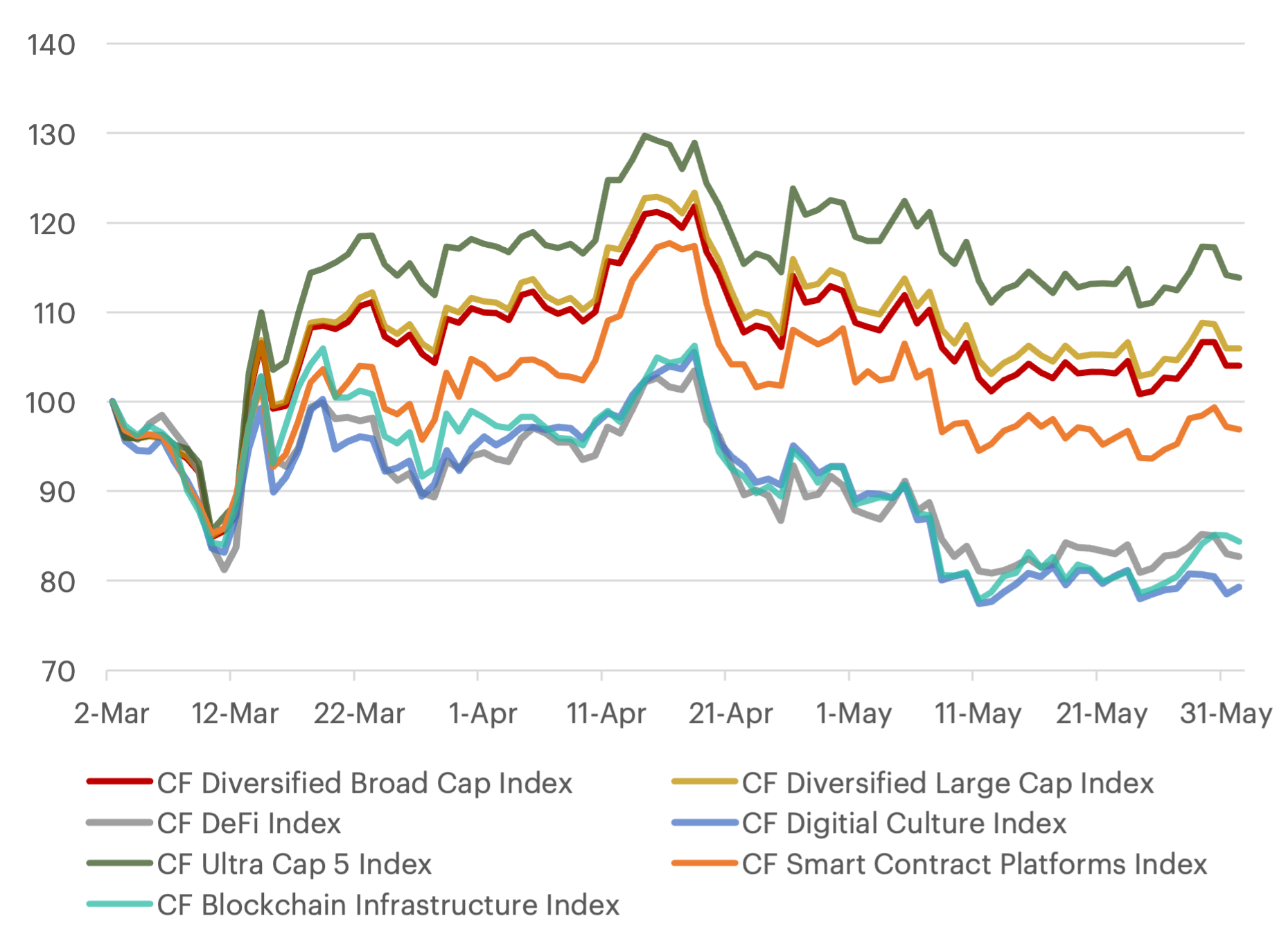 Ultimately, the positive price performance remained concentrated within the multi-cap series indices. This dominance was largely due to the two leading mega-cap tokens, Bitcoin and Ether, which outperformed the rest of their constituents. The CF Ultra Cap 5 Index led the pack, rising over 14% and outperforming the broader market. Conversely, the CF Digital Culture Composite Index faced broadly negative pricing sentiment, finishing the rebalance period as the group’s primary laggard with a fall of over 21%.