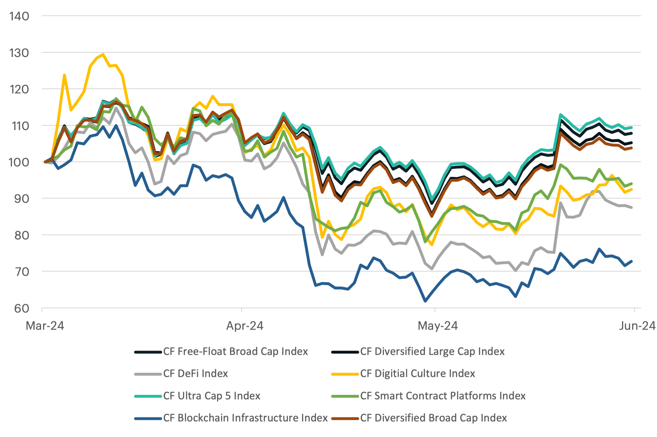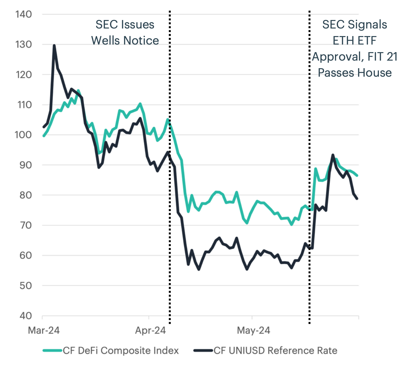 Last quarter's price action was primarily driven by waves of opposing forces. On the constructive side, excitement surrounded the upcoming Bitcoin halving, an event that programmatically reduces the supply of new Bitcoins and has historically provided a catalyst for driving prices higher. Additionally, the successful launch of spot Bitcoin and Ether Exchange Traded Funds (ETFs) in Hong Kong offered a new, regulated way for investors to participate in the digital asset market. This was further bolstered by a surprising shift in U.S. regulatory stance, with the Securities and Exchange Commission's (SEC) approval of a spot Ether ETF signaling a potential thaw in its relationship with cryptocurrencies. Finally, policymakers are now considering landmark legislation to govern the digital asset space. While it was not signed into law for now, such focus by congressional leaders clearly highlights its growing importance within the traditional financial system.