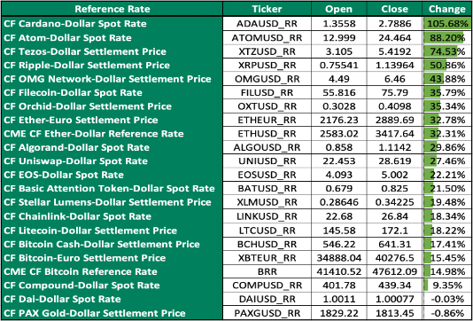 The information contained within is for educational and informational purposes ONLY. It is not intended nor should it be considered an invitation or inducement to buy or sell any of the underlying instruments cited including but not limited to cryptoassets, financial instruments or any instruments that reference any index provided by CF Benchmarks Ltd. This communication is not intended to persuade or incite you to buy or sell security or securities noted within. Any commentary provided is the opinion of the author and should not be considered a personalised recommendation. Please contact your financial adviser or professional before making an investment decision.