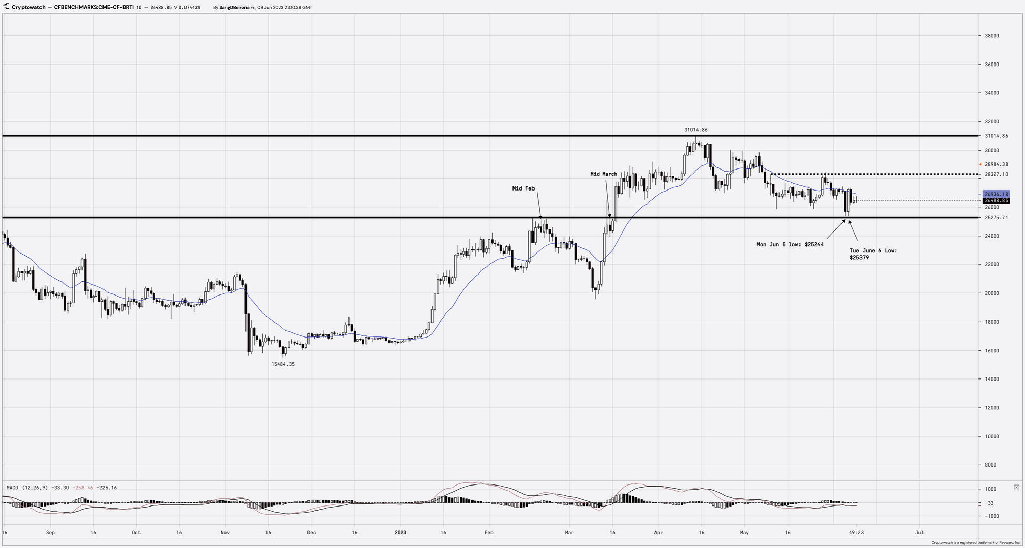 As shown by the chart of our CME CF Bitcoin Real Time Index (BRTI) below, lows corresponding to the publication of the SEC's complaints against Binance and Coinbase on Monday and Tuesday respectively, correspond quite closely to those indicated as support in March, and the price region that had posed visible resistance in February, before giving way to the upside.