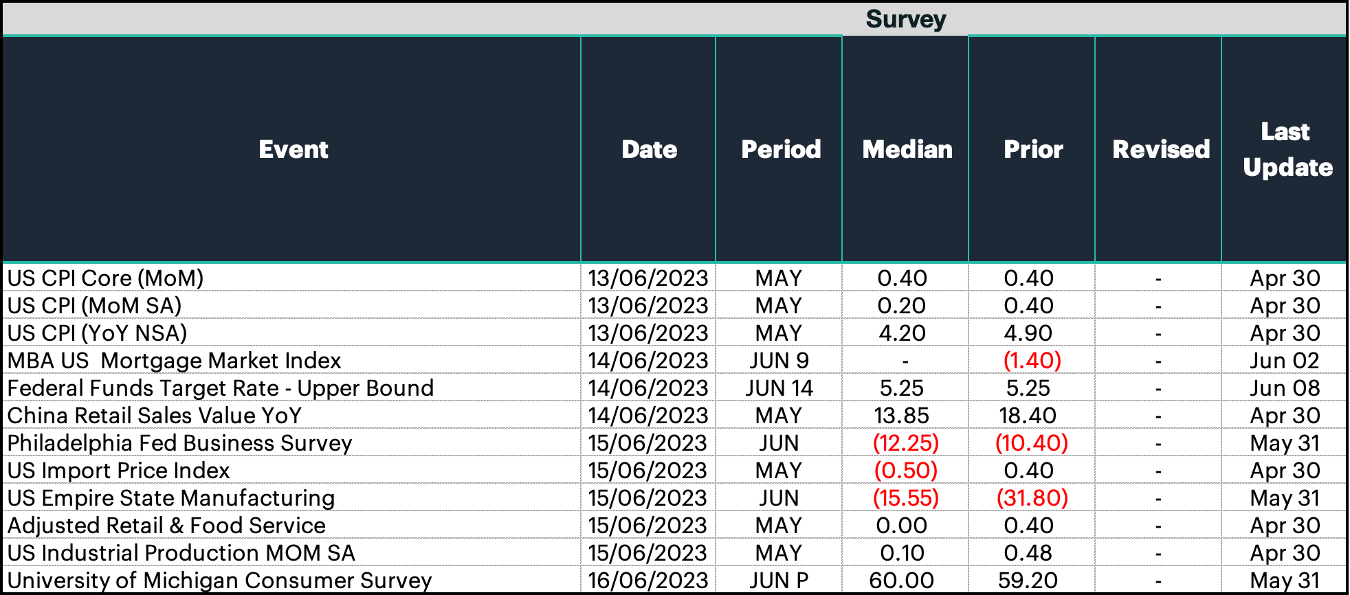 Market participants will have plenty to digest next week. The latest inflation data are set to be released just before the June FOMC rate decision. Headline U.S. CPI accelerated in the prior reading, primarily due to a rise in used car prices that partially offset earlier progress in 'goods' disinflation. On the other hand, forecast models are indicating that prices should cool further in May. The median forecast expects headline prices to rise just 0.2% month-on-month (MoM), while core prices remain more resilient (expected at +0.4% MoM). Markets remain uncertain as to whether the next FOMC decision will be a pause or hike. However, the outcome is likely to hinge on the committee's confidence, during the upcoming meeting, on whether year-end inflation is on track to meet forecasts, or not.