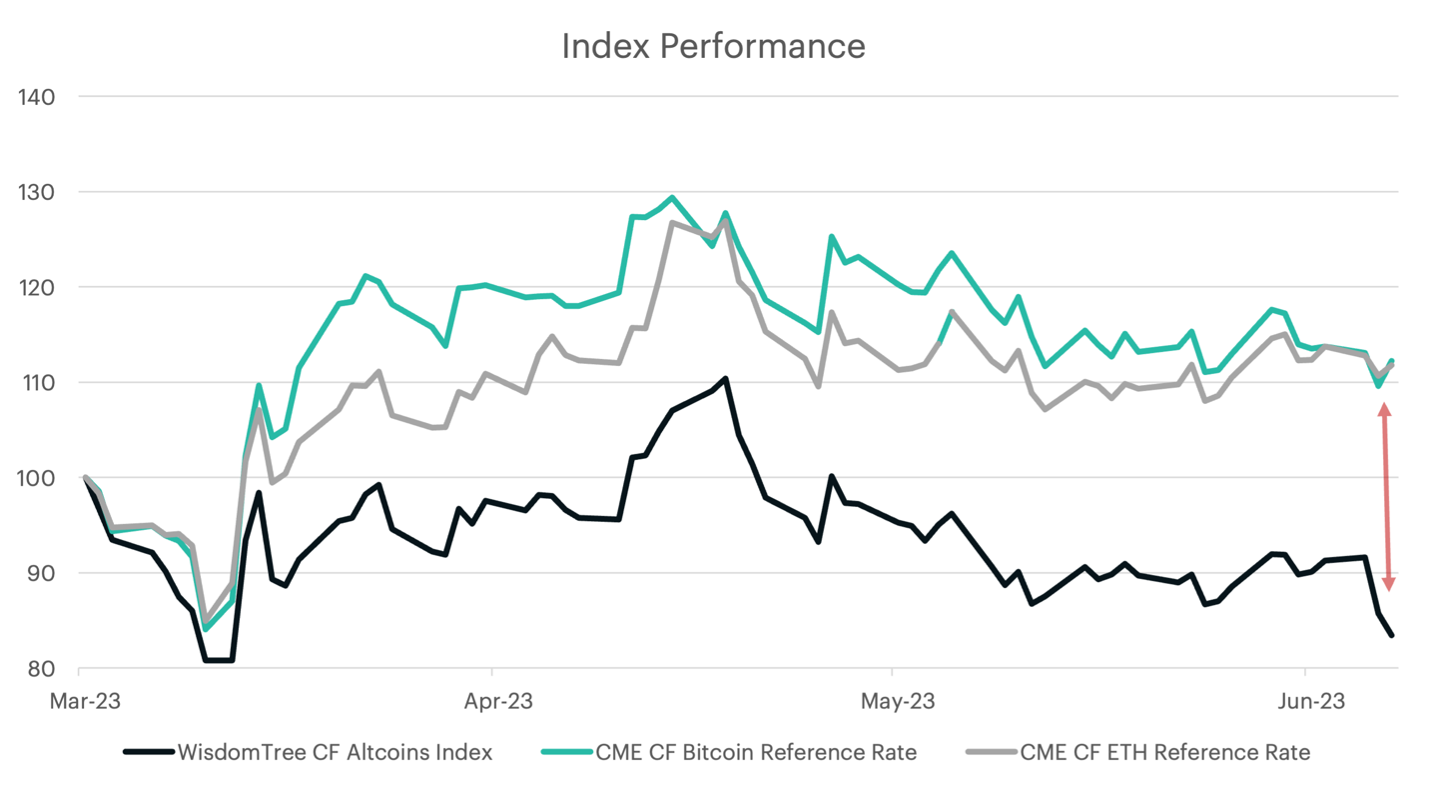 A further dynamic can be seen when we compare the performance of Bitcoin and Ether against small-cap altcoins. The chart below highlights our CME CF Bitcoin and Ether Reference Rates against the WisdomTree CF Altcoins Index (for which CF Benchmarks is Calculation Agent). A growing divergence in strength between the two mega-cap tokens and smaller cap coins is clear. Recent lawsuits have added more tokens to the ever-growing list of unregistered securities, and investor sentiment will likely continue to discount a regulatory risk premium into the price of these altcoins. Conversely, Bitcoin and Ether represent the two largest most decentralized blockchain protocols, and these qualities have continued to provide a measure of 'neutrality' from regulatory intervention. We should expect the implied differential to continue to favor Bitcoin and Ether so long as regulatory uncertainty over altcoins remains.