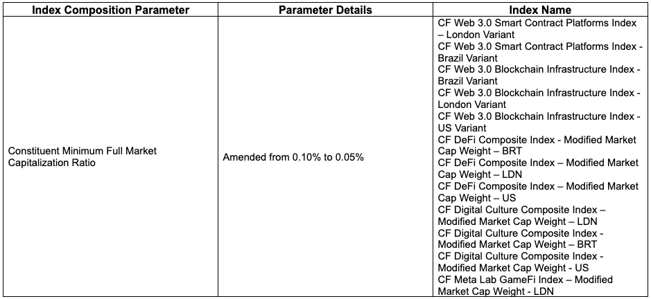 The Administrator announces changes to the Index Methodology for all CF Classification Series indices, and CF Meta Lab Series indices.