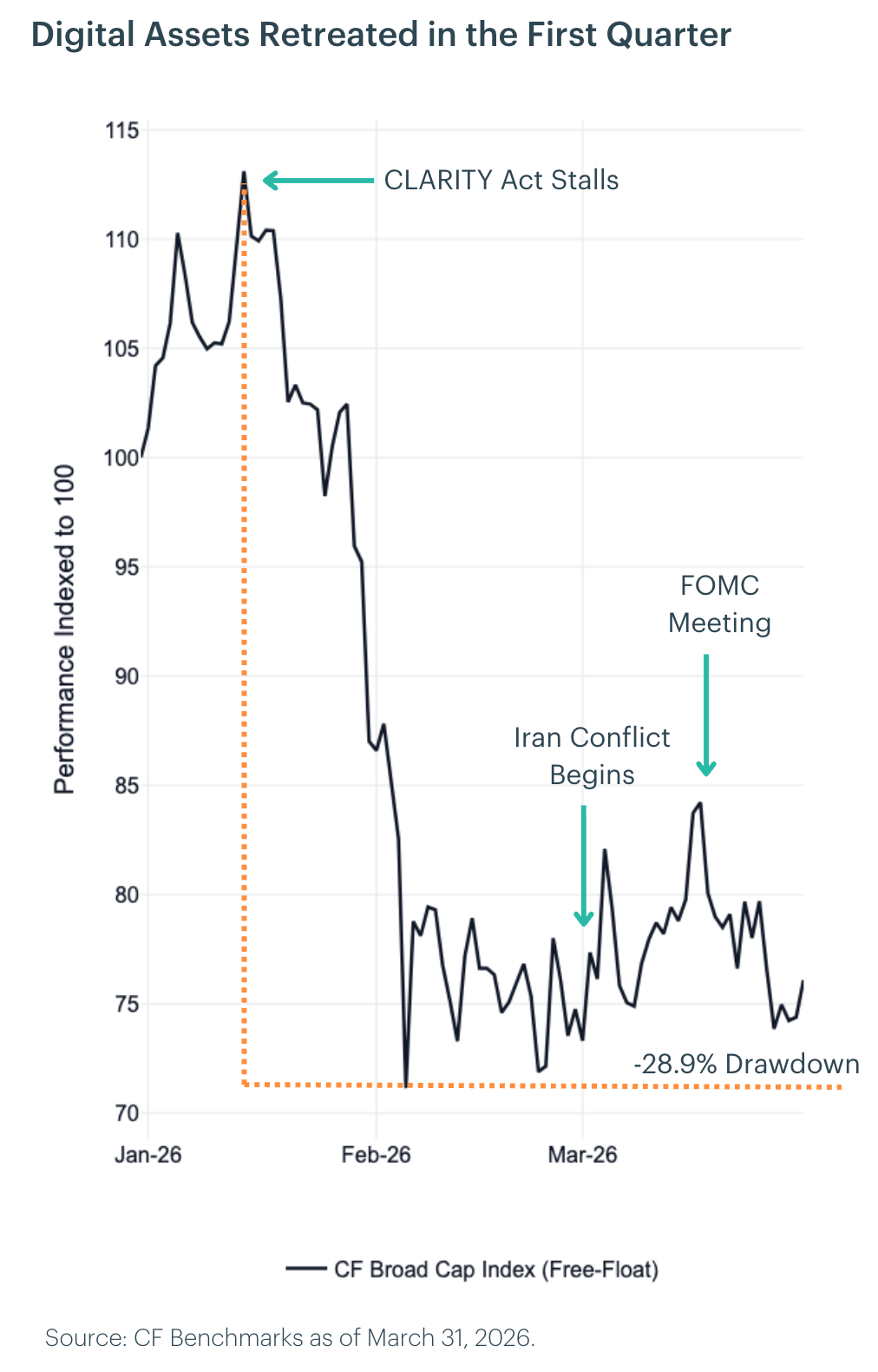 March was dominated by the intensification of the Iran conflict, which became the primary market driver as a sustained surge in oil prices and cross-asset volatility tightened financial conditions. The Fed held rates steady but delivered a hawkish message, with Chair Powell noting that a rate hike had been discussed and emphasizing that cuts remain contingent on further inflation progress, prompting sharp repricing in rate expectations. Bitcoin declined alongside equities before stabilizing into month-end as signs of capitulation emerged. Broader digital asset markets continued to face selling pressure, though the quarter closed with early signs of differentiation as large-cap names posted modest gains even while speculative segments continued to slide.