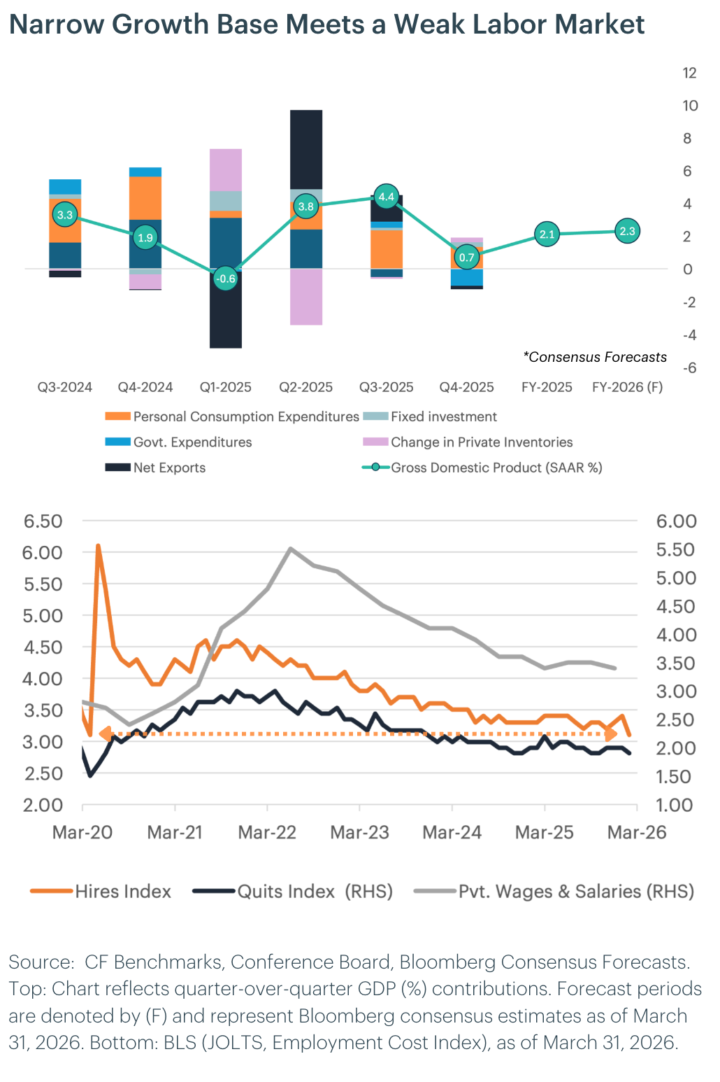 The labor market, which had been cooling gradually, is now showing signs of more acute stress. The private-sector hiring rate has fallen to its lowest level since early 2020, and net job creation turned negative in February for the first time since the pandemic lockdowns. Job openings have resumed their decline, with more timely measures of labor demand turning lower as uncertainty spikes. The quits rate continues to fall, signaling fewer outside options for workers, a dynamic that restrains wage growth but also constrains the consumer spending engine. Critically, the labor market appears too weak to absorb the Iran war inflation shock through a supply-price spiral, which is why we expect the energy-driven inflation impulse to be transitory even as it inflicts real damage on demand. The transmission risk runs through private credit and small business employment, the same channel identified later in our monetary outlook as a possibly underpriced tail risk.