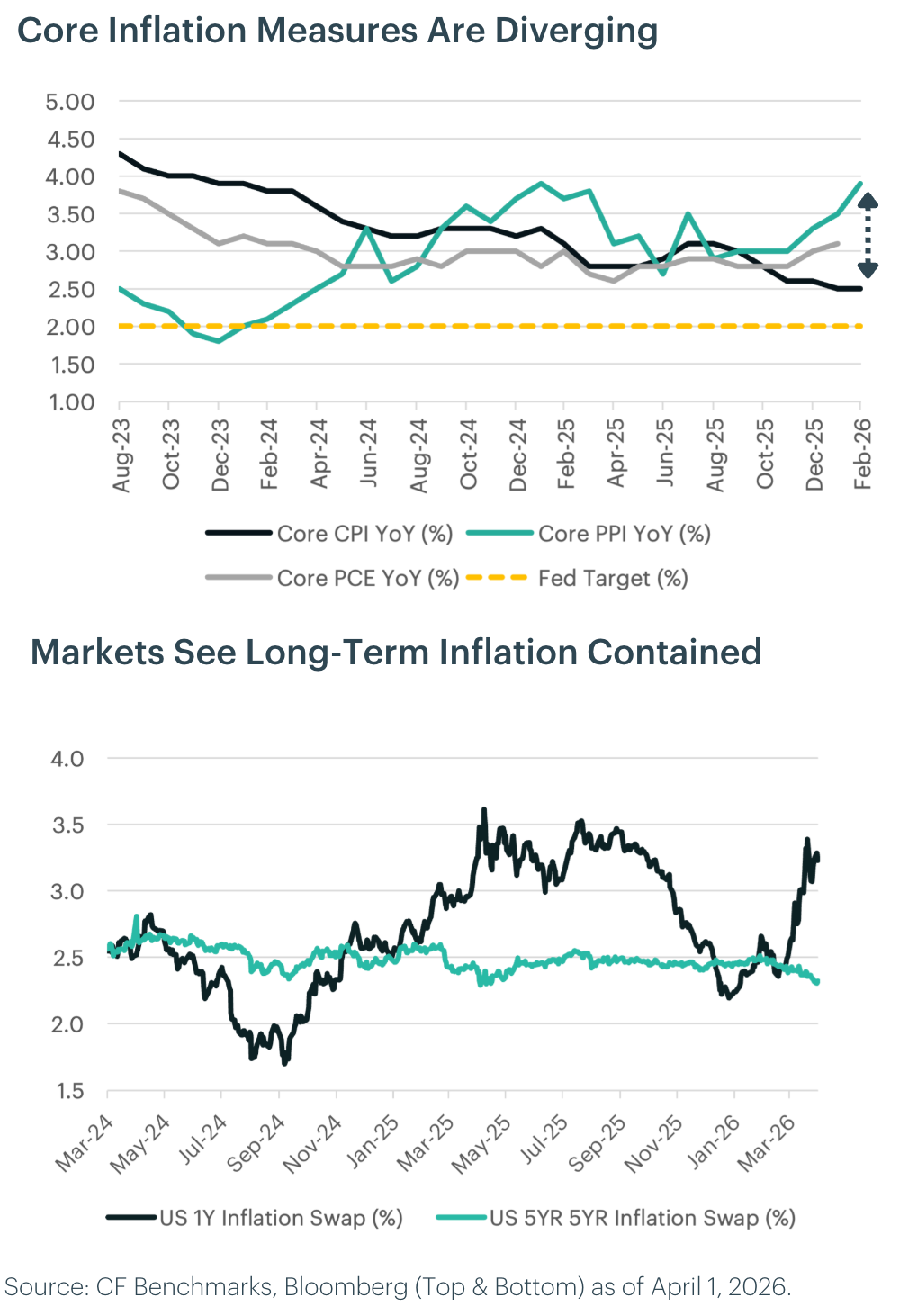 Portfolio Perspective: Our prior call that near-term inflation volatility is transitory rather than indicative of a regime shift stands, but with lower confidence. The base case remains that core inflation decelerates in the second half as demand weakens and shelter disinflation feeds through, but the tail risk of an embedded supply shock has grown. A persistent inflation regime strengthens the case for Bitcoin's fixed-supply store-of-value narrative within the CF Ultra Cap 5 Index, while simultaneously accelerating institutional interest in tokenized real-world assets as onchain proxies for inflation-hedging allocations that traditional portfolios struggle to access efficiently.