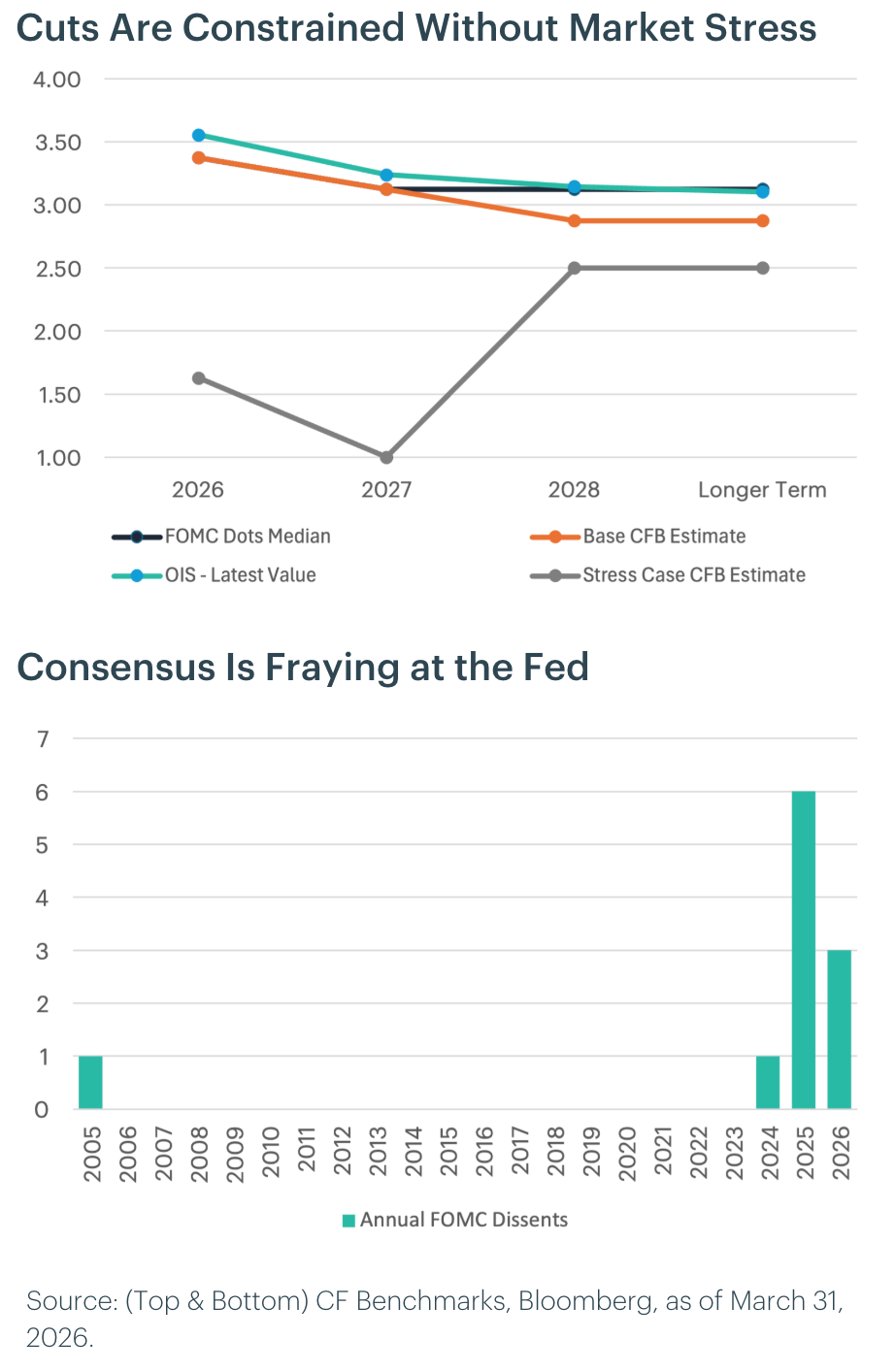 Portfolio Perspective: Our prior dovish call on rates was premature, but our conviction around balance sheet expansion is tracking. The base case narrows to one 25bps cut in the second half, with the balance sheet expanding regardless of the rate path. The tail risk markets are underpricing: if private credit deterioration forces small business layoffs while the oil shock amplifies demand destruction, the Fed's playbook shifts to intermeeting emergency cuts, historically 50-75bps per action, with cumulative easing of 150-300bps when stress is acute. This asymmetry, a grinding base case against a convex stress scenario, favors exposure to CF Bitcoin Volatility Indices while the basis trading ecosystem benefits from persistent contango as balance sheet expansion improves structural liquidity regardless of which path materializes.