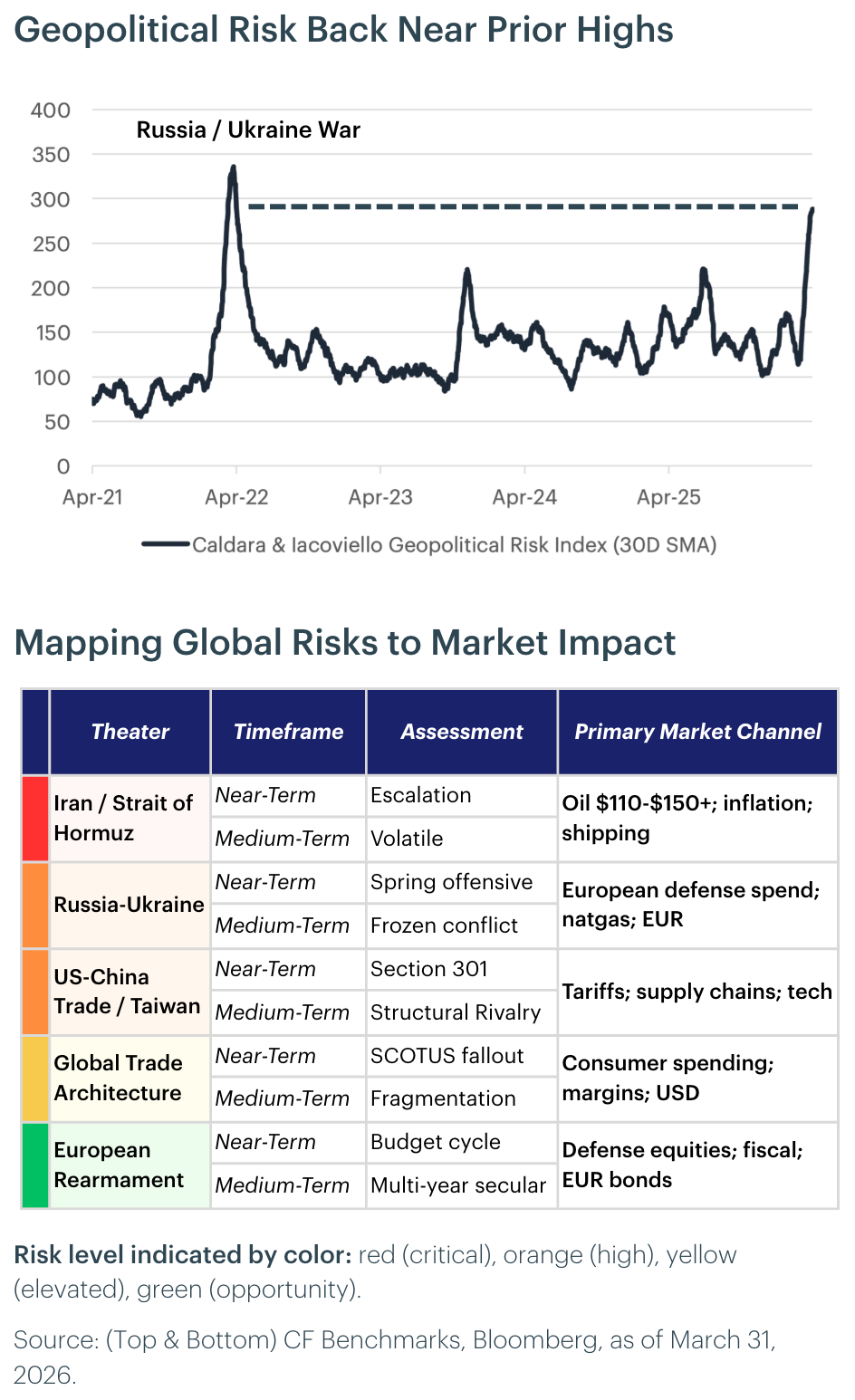Portfolio Perspective: This is the first edition to include a dedicated geopolitical section, reflecting our view that the Iran conflict and the regulatory buildout are primary drivers of risk and opportunity, not background noise. The war's duration determines whether the macro outlook resolves toward the dovish or stagflationary scenario; the regulatory buildout determines the pace of institutional onboarding. Digital assets' 24/7 market access has already served as a clear catalyst for defensive positioning during weekend geopolitical escalations, reinforcing the asset class's role in real-time risk management. The convergence of stablecoin regulation under the GENIUS Act and SEC-CFTC jurisdictional clarity creates a structural tailwind for the CF DeFi Composite Index, as compliant onchain infrastructure becomes investable at institutional scale for the first time, while prediction market protocols positioned to price geopolitical event risk in continuous session represent an emerging category we expect to track in future editions.