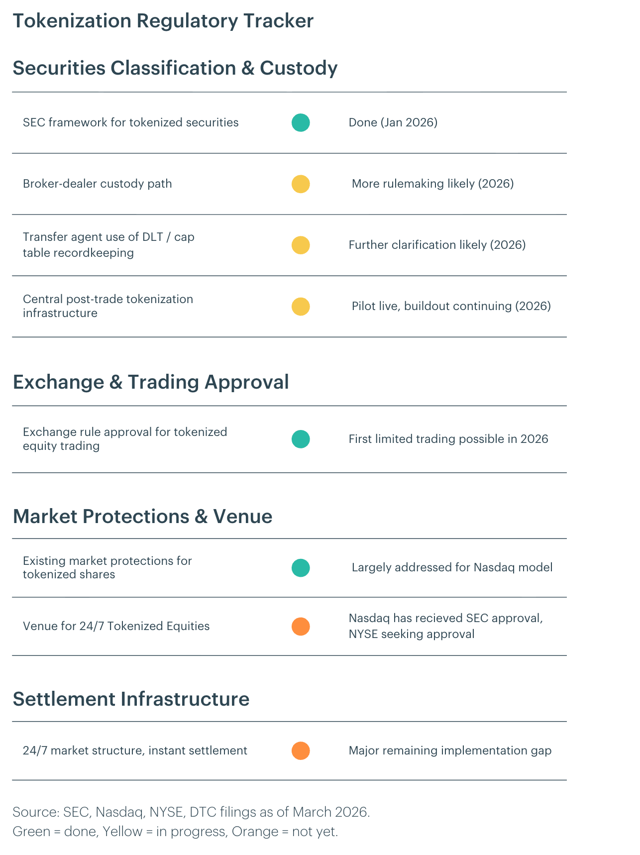 The SEC staff has outlined a framework for tokenized securities, broker-dealer custody under Rule 15c3-3(b)(1), and DLT-enabled transfer agent recordkeeping. While these interim measures leave meaningful gaps, including the treatment of stablecoins within securities market infrastructure, secondary market liquidity fragmentation, and the full scope of broker-dealer obligations, the remaining work now looks increasingly operational and venue-specific rather than purely definitional. Our base case is that limited, venue-specific U.S. tokenized equity trading before the end of 2026 is a credible scenario, particularly as offshore jurisdictions continue to advance tokenized equity frameworks more quickly, with the remaining hurdles most likely to be addressed in 2H 2026 as venue infrastructure matures and the SEC completes additional rulemaking.