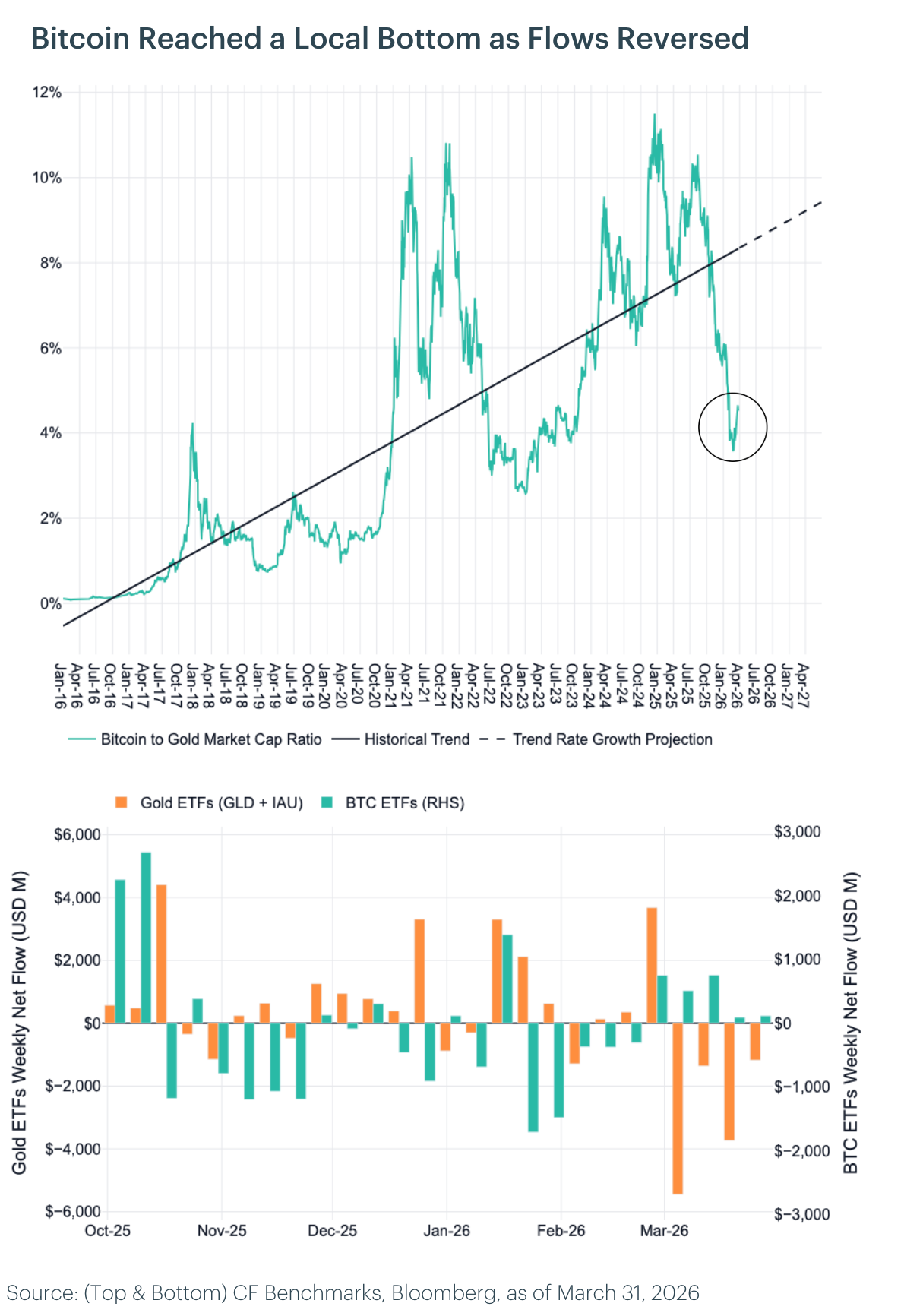 Portfolio Perspective: The catch-up trade has become meaningfully more compelling since our initial Q4 2025 publication. With the ratio nearly 47% below trend and fund flows now shifting in favor of Bitcoin, the risk-reward profile for Bitcoin relative to gold is at its most favorable level in over two years. We continue to view mean reversion in this ratio as a central theme for 2026 and consider the current dislocation a high-conviction tactical opportunity for allocators with appropriate risk tolerance.