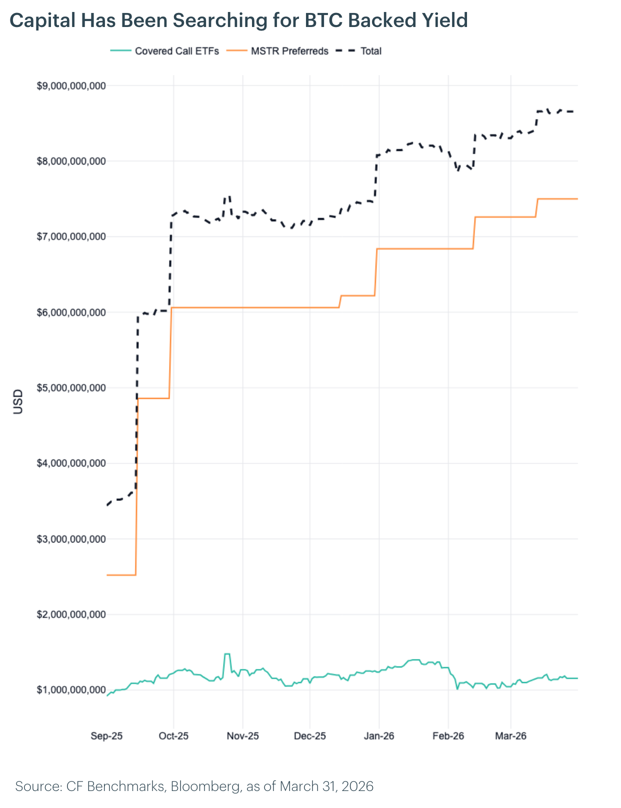 The market for Bitcoin-backed yield products has grown rapidly, with total capital across covered call ETFs and perpetual preferred instruments now exceeding $8 billion. The majority sits in Strategy Inc.'s preferred equity stack, which has raised over $7.5 billion across five series through IPO offerings and ATM programs. Covered call ETFs such as BTCI have demonstrated strong asset gathering, growing from under $50 million to nearly $1 billion in 2025 alone.