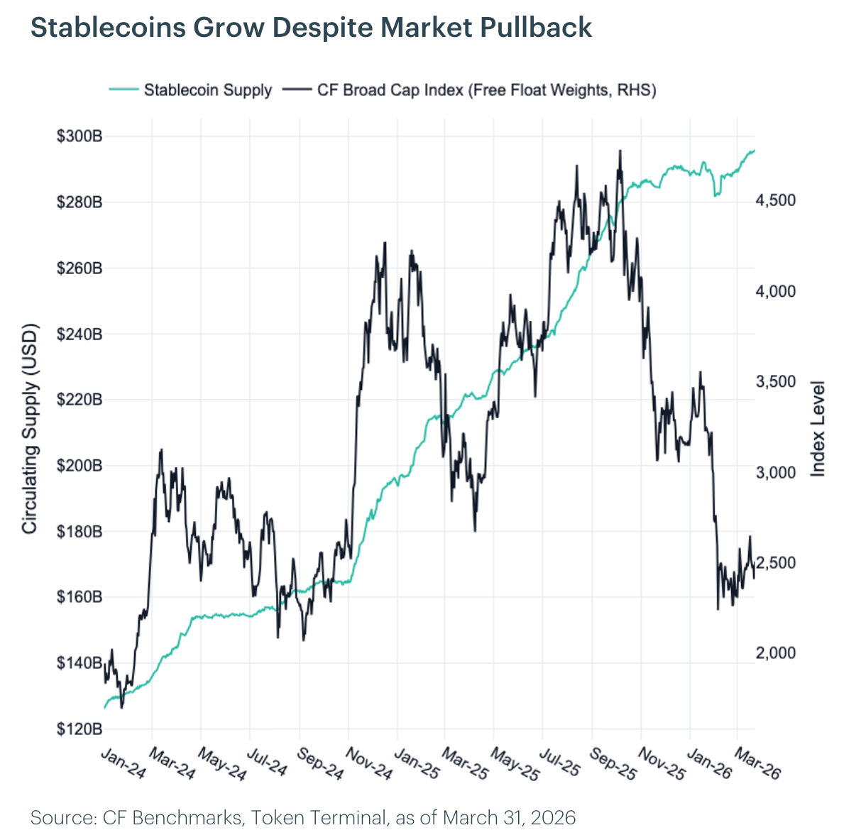 The total stablecoin market capitalization reached approximately $312 billion in March 2026, having grown over 50% year-over-year from roughly $220 billion in March of 2025. Notably, stablecoin supply continued to expand even as the broader crypto market pulled back in Q1 2026, suggesting a structural decoupling from speculative risk appetite. USDT remains the dominant issuer at $187 billion (roughly 60% market share), while Circle's USDC has grown to $75.7 billion and captured a growing share of stablecoin transaction volume in early 2026.
