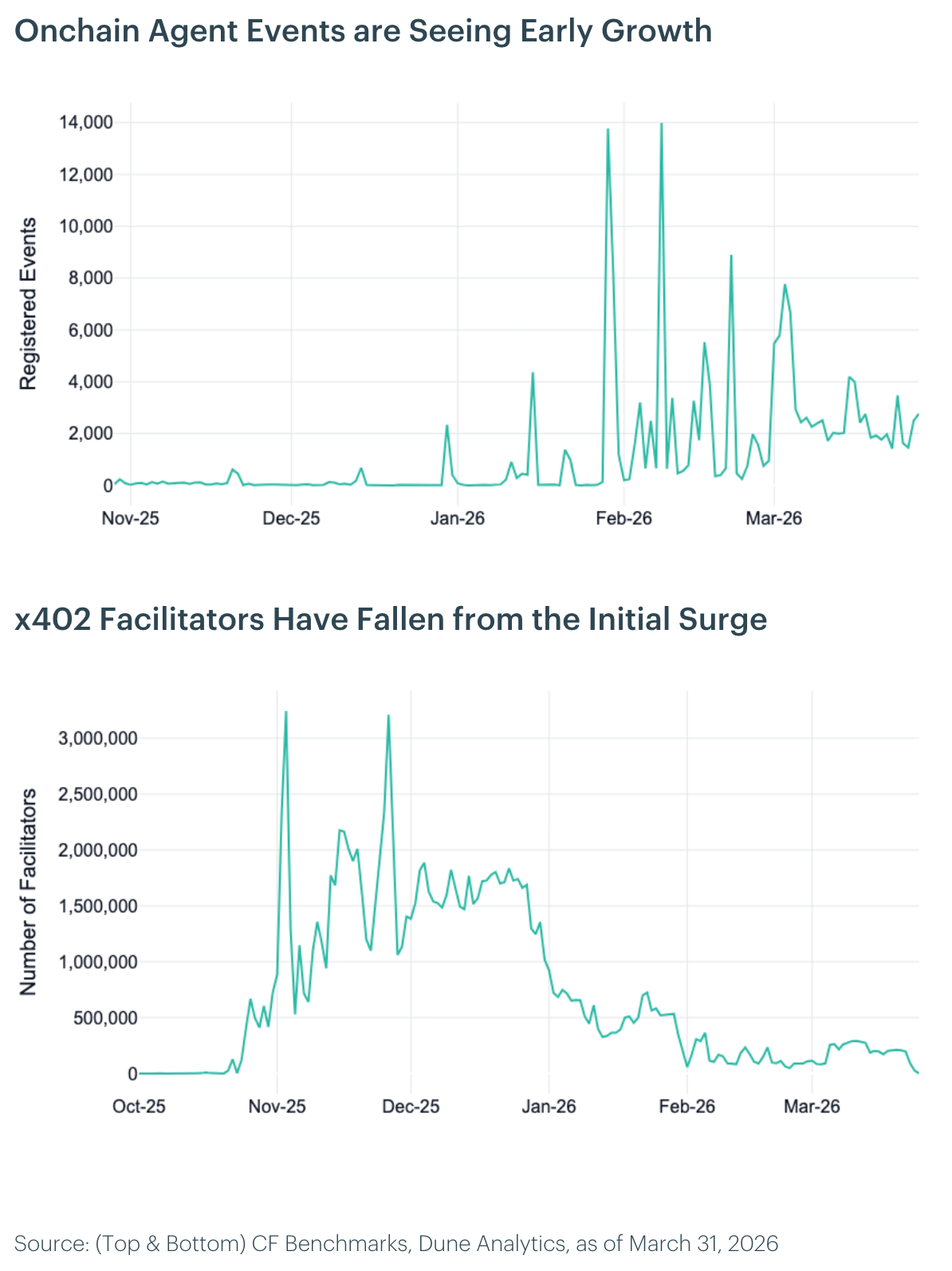 The x402 protocol, an open payment standard that embeds stablecoin micropayments directly into HTTP requests, is emerging as foundational infrastructure for autonomous agent commerce. By enabling AI agents and software services to transact programmatically, x402 establishes a native payments layer for the machine economy and introduces a structurally new source of stablecoin demand. Facilitators, which verify and settle x402 payments, have grown to approximately 3 million since launch, with adoption accelerating following Stripe's integration for USDC payments on Base in February 2026. As agent-driven use cases scale, we expect not only continued growth in facilitator counts but also a meaningful increase in payment frequency and stablecoin velocity, reinforcing a positive feedback loop between agent activity and onchain settlement demand.