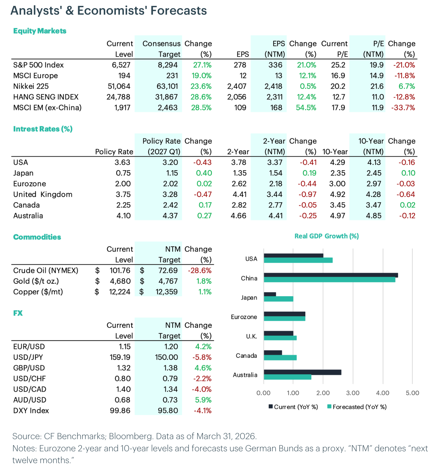 Equities: Analysts maintain a broadly positive outlook for equities, with the Hang Seng Index (+28.6%) and emerging markets ex-China (+28.5%) leading major forecasts. European markets (+19.0%) and Japan (+23.6%) are also expected to perform well. U.S. equities are forecast to rise 27.1%, with S&P 500 earnings per share projected to grow by 21.0%. Valuation multiples are expected to contract across major markets, with the S&P 500's P/E falling 21.0%, suggesting price gains are driven entirely by earnings growth rather than multiple expansion.