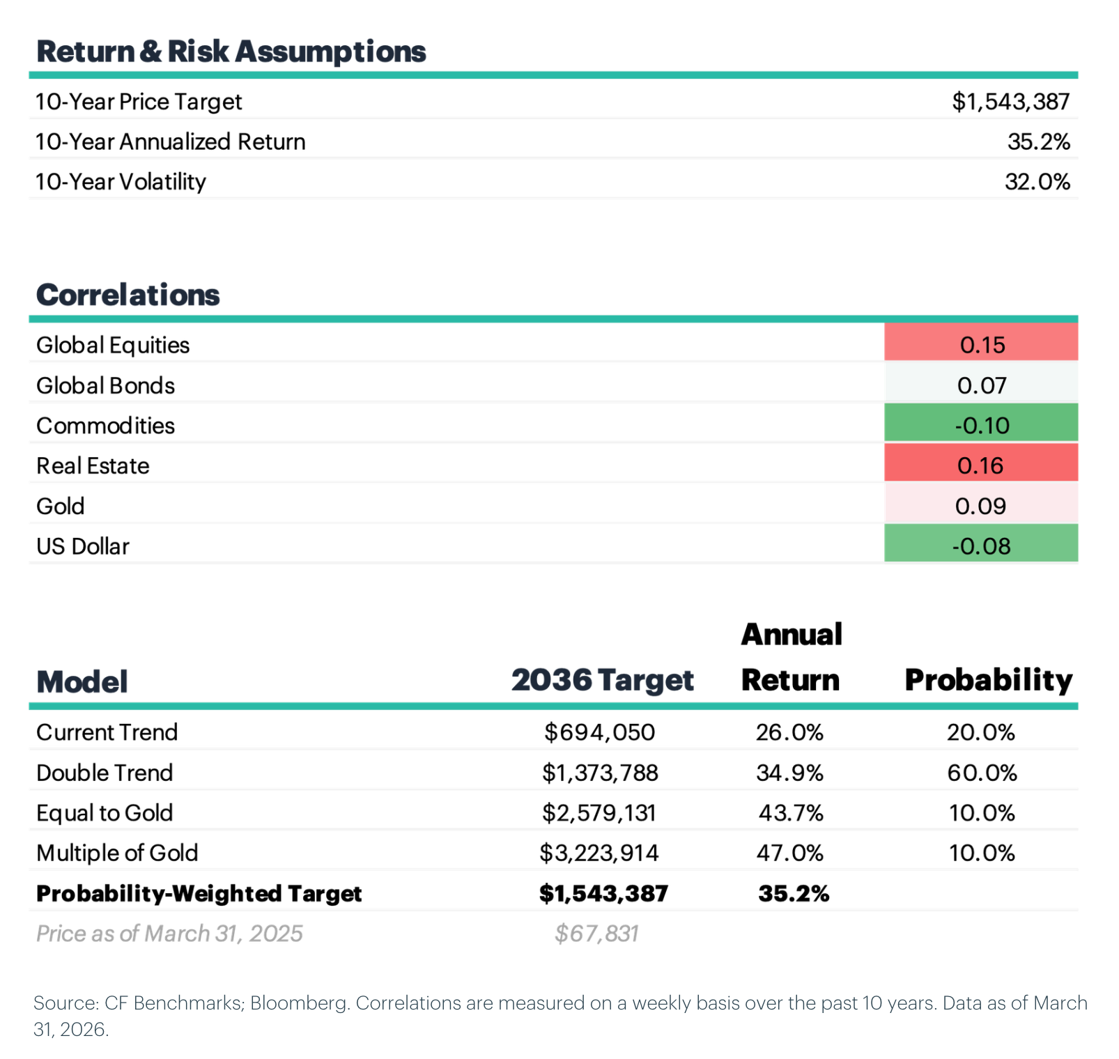 Returns: Our 2026 capital market assumptions project a 10-year annualized return of 35.2% with a probability-weighted 2036 price target of $1,543,387. The price target incorporates probability-weighted scenarios in the store-of-value market, assigning 60% weight to double-trend growth, 20% to current trend continuation, and 10% each to gold parity and gold outperformance.