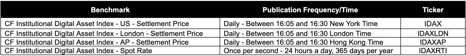 Publication of the CF Institutional Digital Asset Index Settlement Prices, and CF Institutional Digital Asset Index Spot Rate will commence on August 6th, 2024.