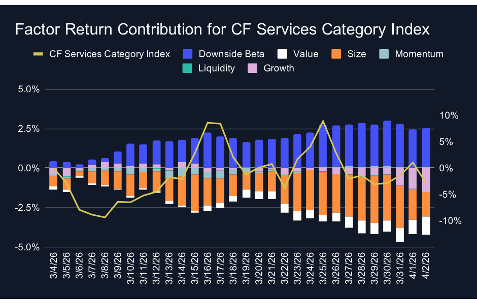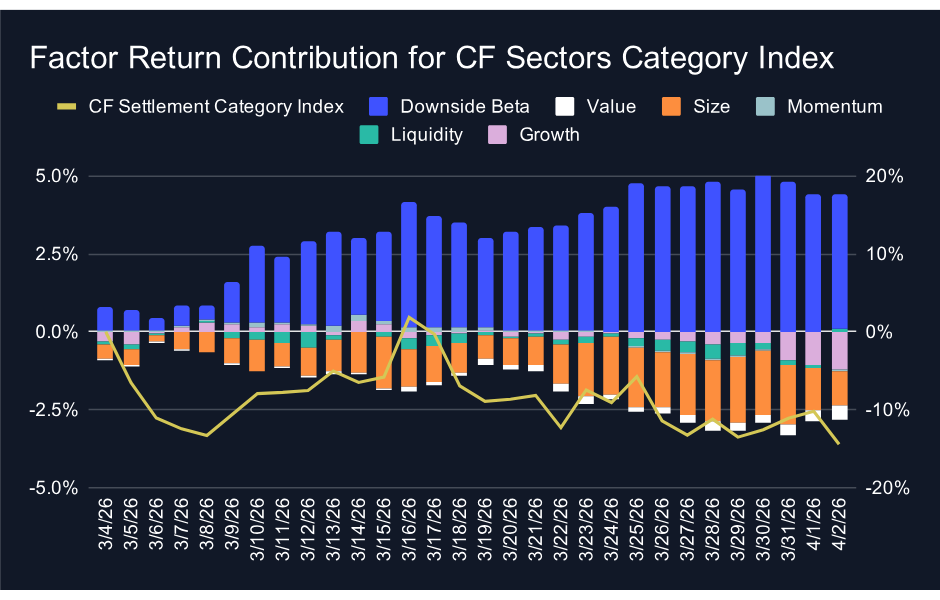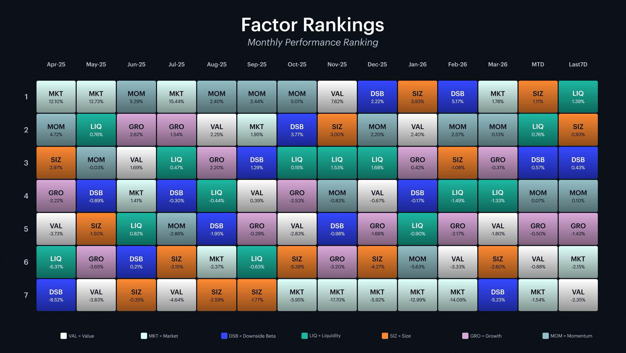 The quilt chart tells a striking story this week. Liquidity leads the weekly rankings at +1.4%, with size in second at +0.9% and downside beta in third at +0.4%. Value has fallen to last place at -2.4%, below even the market factor at -2.2%. On a month-to-date basis, size leads at +1.1%, followed by liquidity at +0.8% and downside beta at +0.6%, while value and the market factor sit at the bottom. Looking back at March, the market factor led at +1.8% while downside beta finished last at -5.2%. The transition into April has seen a meaningful shift: the factors associated with smaller, less liquid, and more defensive assets are now leading, while value and market - the factors tied to fundamentals and broad directional exposure - are lagging. The six-week rotation has now come full circle twice: from downside beta to value to growth to liquidity to momentum and now back to liquidity and size. For investors, the persistence of the rotation without a clear winner consolidating leadership is itself a signal. It suggests the market lacks strong conviction in any single theme and is cycling through factors opportunistically. Until one factor or group of factors establishes sustained leadership, tactical positioning remains more appropriate than concentrated bets.