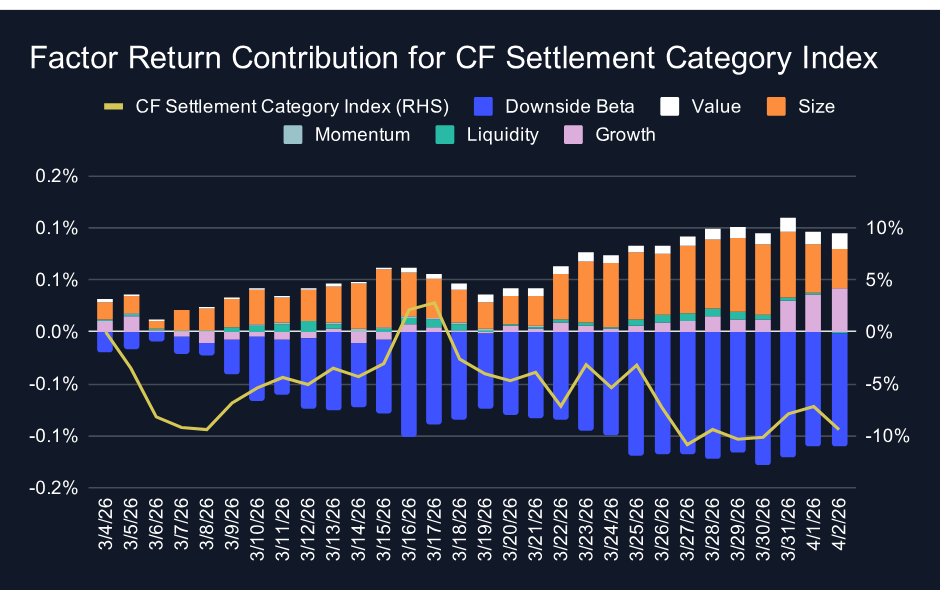 The Settlement category has undergone a notable shift from prior weeks. Factor contributions are effectively flat over the trailing 30 days, with individual factor contributions all near zero. This is typical for Settlement given its heavy concentration in large-cap tokens like BTC and ETH, which tend to have muted factor exposures. However, the index is down -9.4% over the period, a significant deterioration from the positive territory it occupied in prior weeks. The roughly 9 percentage point gap between flat factor contributions and the index decline means that the sell-off in tokens in the Settlement category is almost entirely a directional market move rather than a factor-driven one. For investors, Settlement's previous structural advantage, built on positive factor alignment, has eroded. The category is now subject to the same broad selling pressure as the rest of the market, and its factor-neutral positioning offers less differentiation than it did during the earlier stages of the drawdown.
