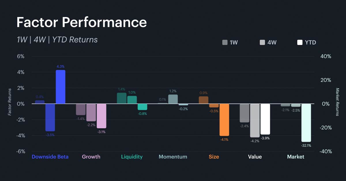 The market declined 2.15% on the week, extending the year-to-date loss to -32.1%. Liquidity led the weekly factor rankings at +1.4%, reclaiming the top spot. Size followed at +0.9%, its strongest weekly showing in months. Downside beta posted a modest +0.4% on the week, a notable stabilization after five consecutive weeks of declines, though it remains down -3.5% over four weeks. Its year-to-date gain has held at +4.3%. Momentum was roughly flat at +0.1%. The laggards this week were value at -2.4% and growth at -1.4%, with value now down -4.2% over four weeks and -3.9% year to date. The sharp reversal in value is the most significant development this week. After leading the weekly rankings in early March, value has now posted back-to-back weeks of losses and sits at the bottom of both the weekly and monthly standings. The combination of liquidity and size leading while value sells off suggests that capital is rotating toward less liquid, smaller-cap segments of the market at the expense of names with strong fundamentals. This is a risk-on pattern that tends to coincide with speculative positioning rather than durable conviction.
