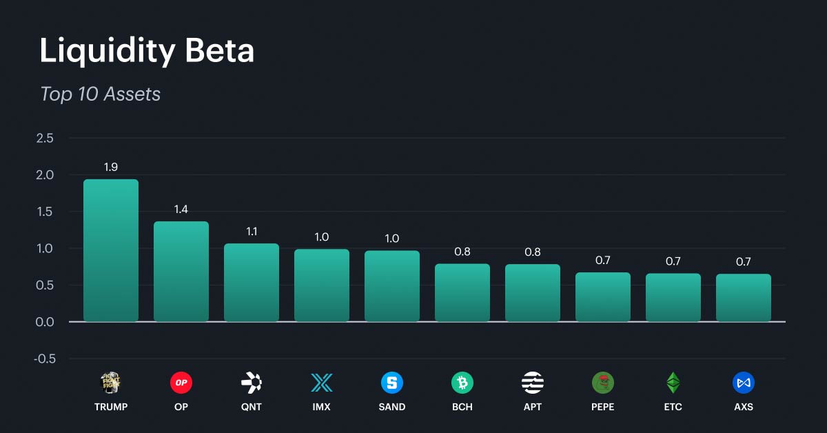 With liquidity reclaiming the top of the weekly rankings, this factor's beta distribution deserves attention. The liquidity factor is sign-inverted, meaning higher scores are assigned to less liquid assets, capturing the premium investors earn for holding assets that are harder to trade. The top 10 is led by TRUMP at 1.9, well ahead of the field, followed by OP at 1.4, QNT at 1.1, and IMX and SAND near 1.0. BCH, APT, PEPE, ETC, and AXS fill out the group between 0.7 and 0.8. The composition is telling: meme coins, mid-cap layer-1 and layer-2 platforms, and gaming tokens dominate the highest liquidity betas. These are segments characterized by thinner order books and lower turnover relative to circulating supply. In a market that declined 2.2% on the week, the liquidity factor's +1.4% return means these illiquid names outperformed significantly. This is consistent with speculative flows rotating into less trafficked corners of the market. For investors, the liquidity premium is real but carries meaningful execution risk. The same illiquidity that amplifies gains on the way up will likely amplify losses on the way down and exit costs in these names can be substantial during periods of elevated volatility.